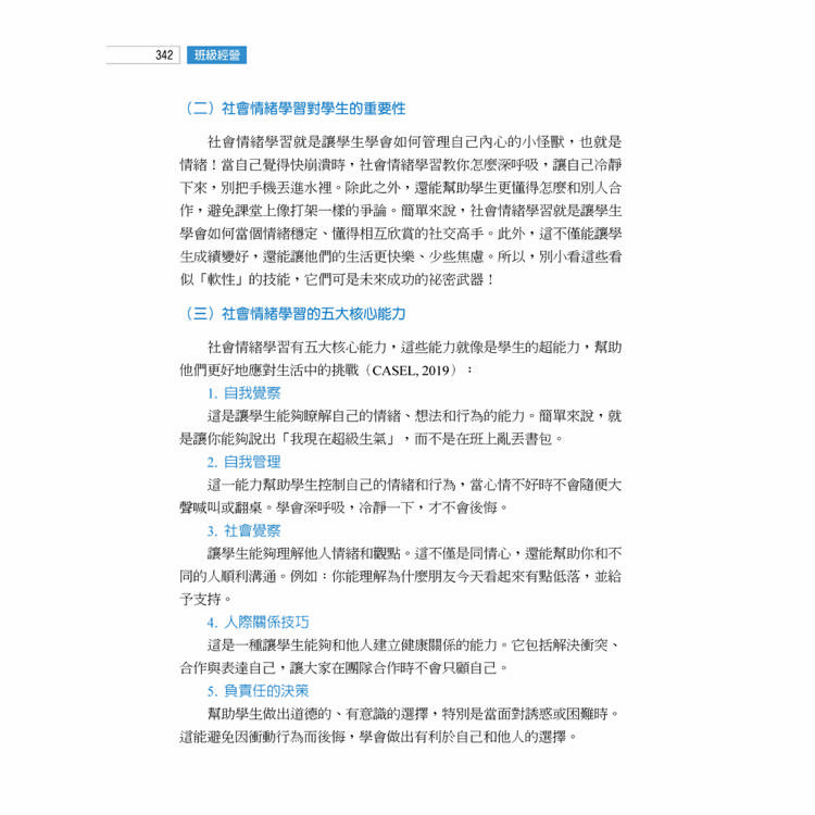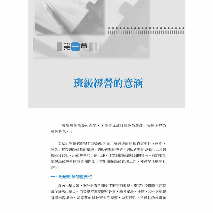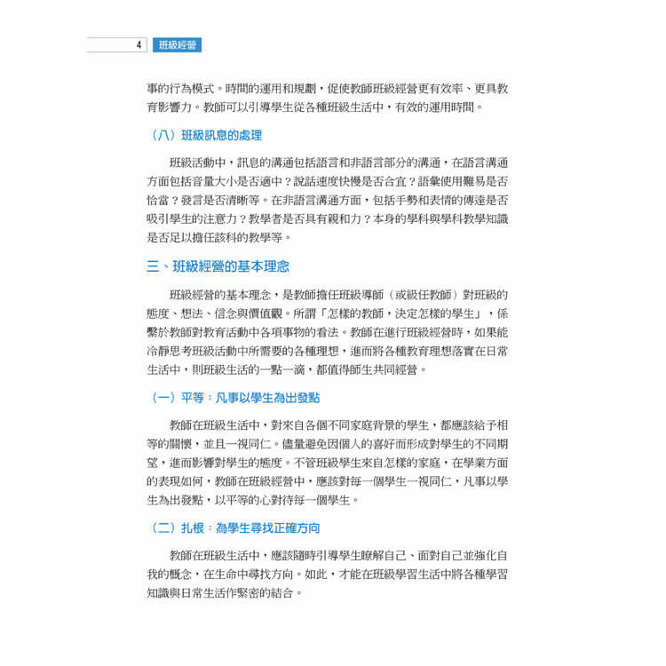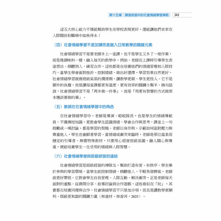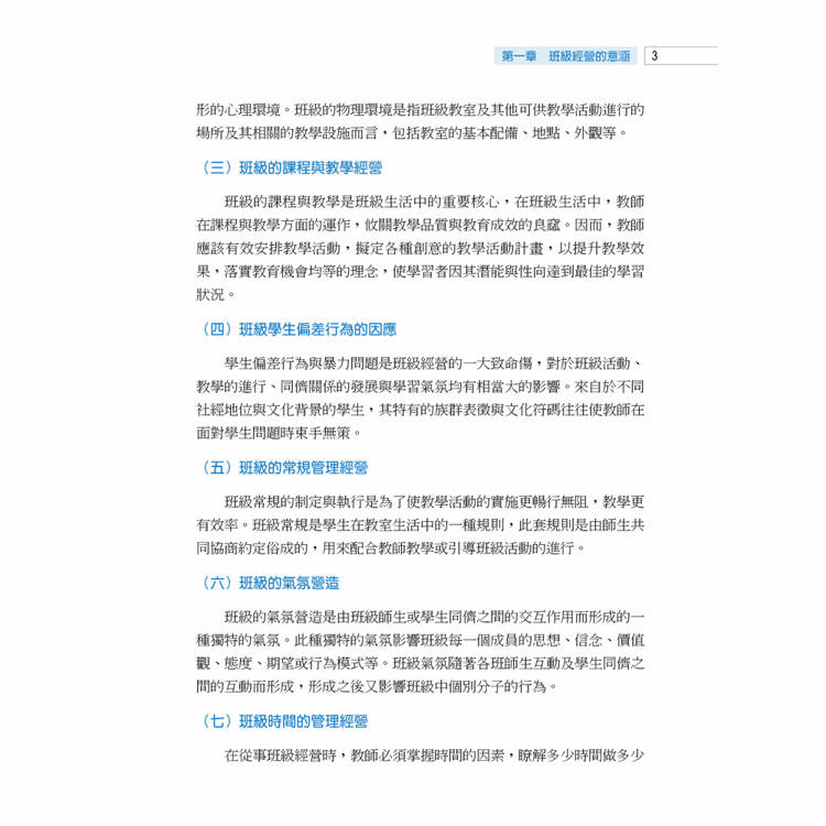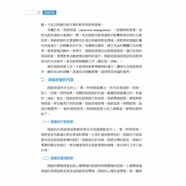 《班級經營》是一本兼具理論深度與實務操作的教育專書,特別為中小學教師與師資培育課程量身打造。全書共十五章,涵蓋班級常規、氣氛營造、教學策略、學生輔導、時間管理、親師溝通、校園危機與霸凌因應等面向,內容豐富、結構完整。修訂版特別新增「課堂經營中的社會情緒學習策略」一章,回應當前教育現場對情緒教育與關係經營的高度需求。書中以具體策略、真實案例與幽默語調,幫助教師提升班級經營的效能與溫度。不論是初任導師或資深教師,皆能從中找到實用工具與心靈共鳴。