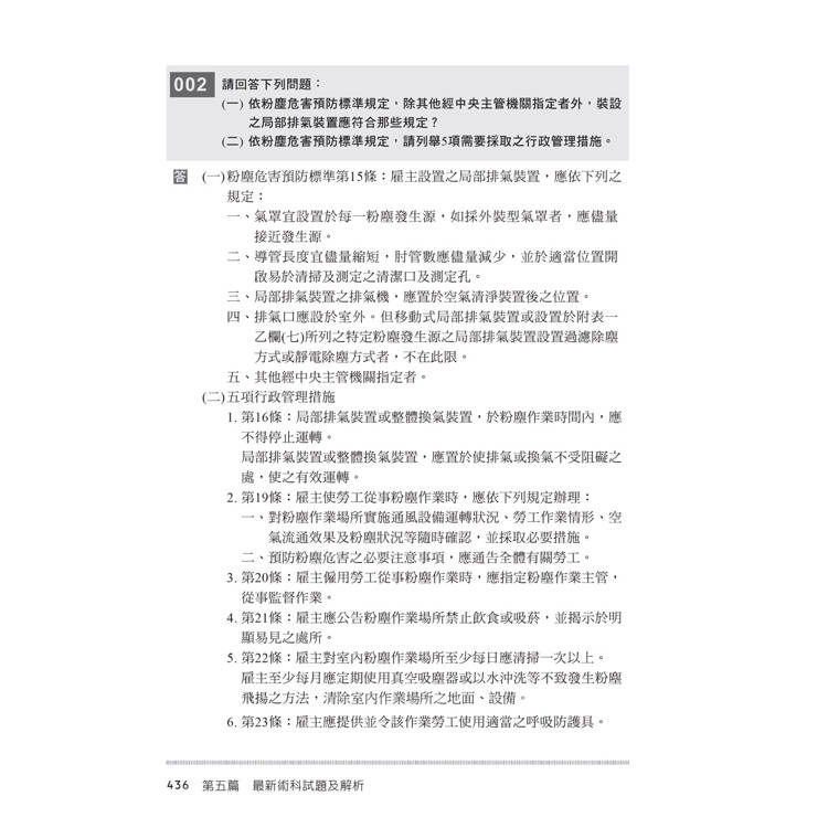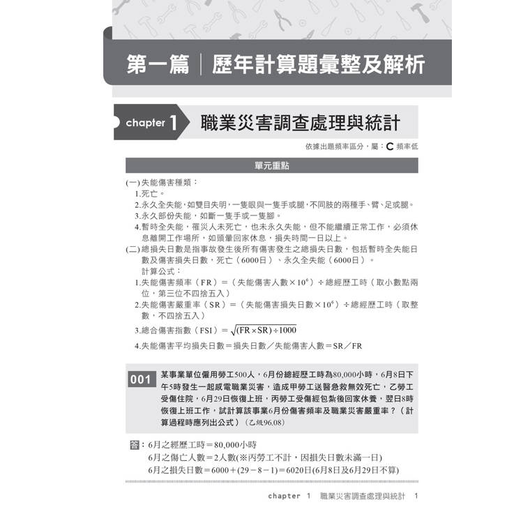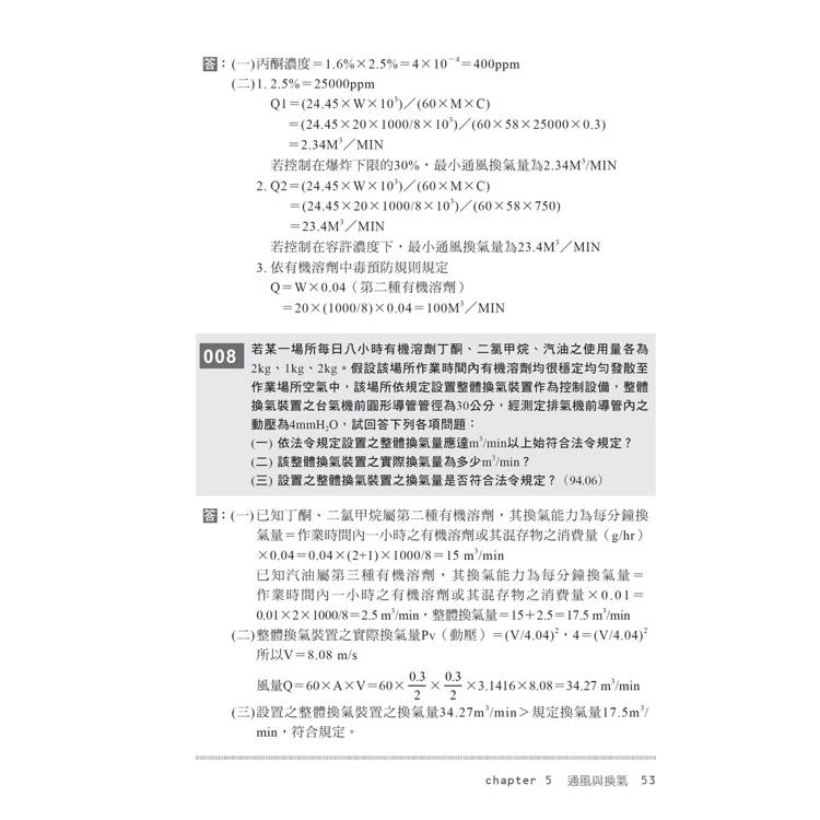 本書分為五部分,第一部分為歷年計算題匯整及解析,每次有一題(20分),這一題一定要把握住,其餘問答只要答對一半就可過關。第二部分為歷年問答題彙整及解析讀者在背誦時務求理解並多予聯想,記住每題的關鍵詞以加深印象,並多注意時事及閱讀工業安全科技等雜誌以攝取新知,增加廣度。第三部分是各職類共同科目學科題庫,佔分16分,一定要看過。第四部分為近年學科試題彙整及解析可作為模擬考練習之用並予以解析。第五部分是最新的術科試題解析。最後要提醒的是從過去出題情況來看,除法規外,出題比例最多的是勞工健康保護規則、噪音、化學因子測定、人因、缺氧、有機溶劑、個人防護具、通風、局排。此外,計算題(包括噪音、化測、通風)的拿分亦是證照考取的保證,一定要會。