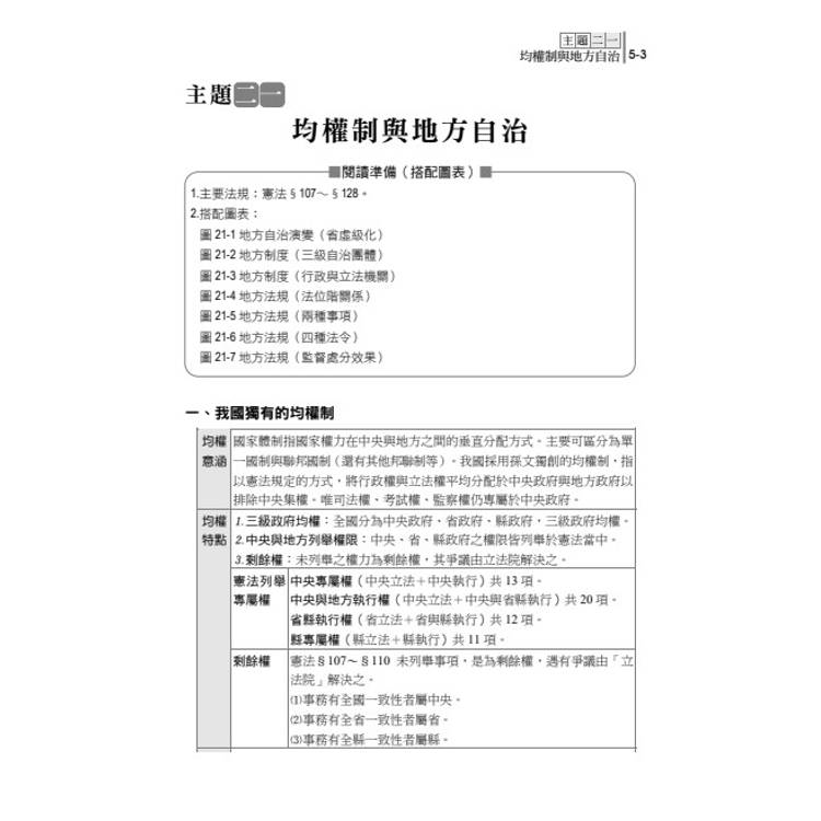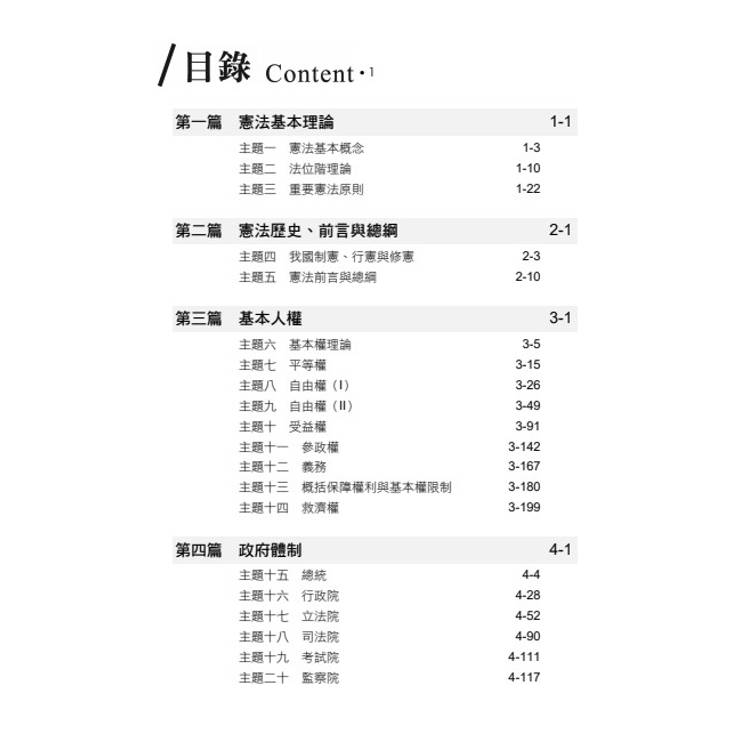 本書為憲法讀本,專為國考《中華民國憲法》選擇題型而設計,適用各類國家考試與研究所考生。全書按國考方向劃分為「22組主題」,以簡明圖表與白話的憲法判決文說明憲法內容,考生可以迅速從圖表找出試題答案。