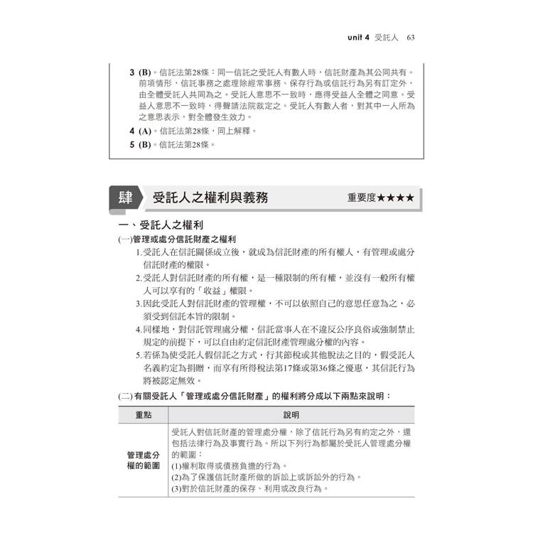 本書係依據台灣金融研訓院所出版的「信託法制」及「信託實務」二本書為基礎,將重點歸納整理後,讓欲面對信託業務人員證照考試或對信託有興趣的讀者容易理解與為測驗做準備。信託法規重點在信託法及信託業法,信託法規的部分相對於信託實務的部分較為簡單,因此是考試時取得高分的重點科目,特別是在歷屆考古題的閱讀時,配合法規,加強理解與記憶會是取得高分的重點。至於信託實務的部分,因業務內容說明著重各類信託商品的解釋與規範各自獨立,不易理解。特別容易在法規內與與解讀上有新增、修改或刪除調整的情形發生,因此,本書就信託實務的整理資料以系統性重點整理提醒與歸納,協助各位讀者在理解信託業務內容時,輔以考古題的解釋,對信託業法的瞭解有相當的助益與幫助。