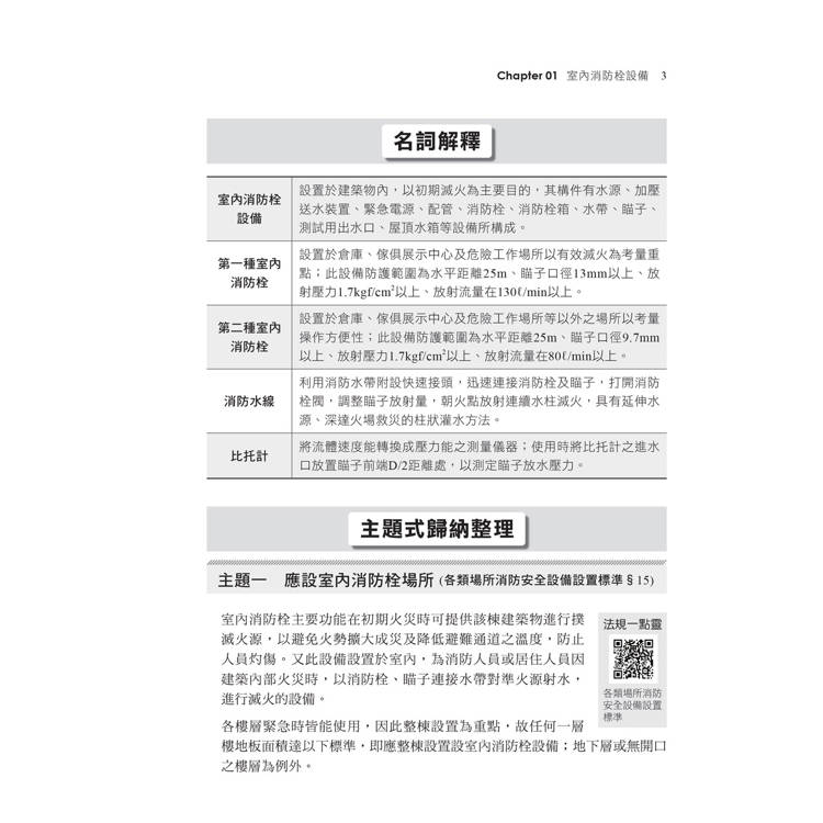 (二)重點掃描:有系統、有組織、有連貫性與綜合性與各類場所消防安全設備設置標準法條串連,請參照本書所提供法令標準研讀;相信你們的慧眼必定看出筆者對於本書的用心程度,肯定本書能夠帶給你實質上幫助。因為每項內容以最精簡字句闡述,便於記憶而有系統吸收。