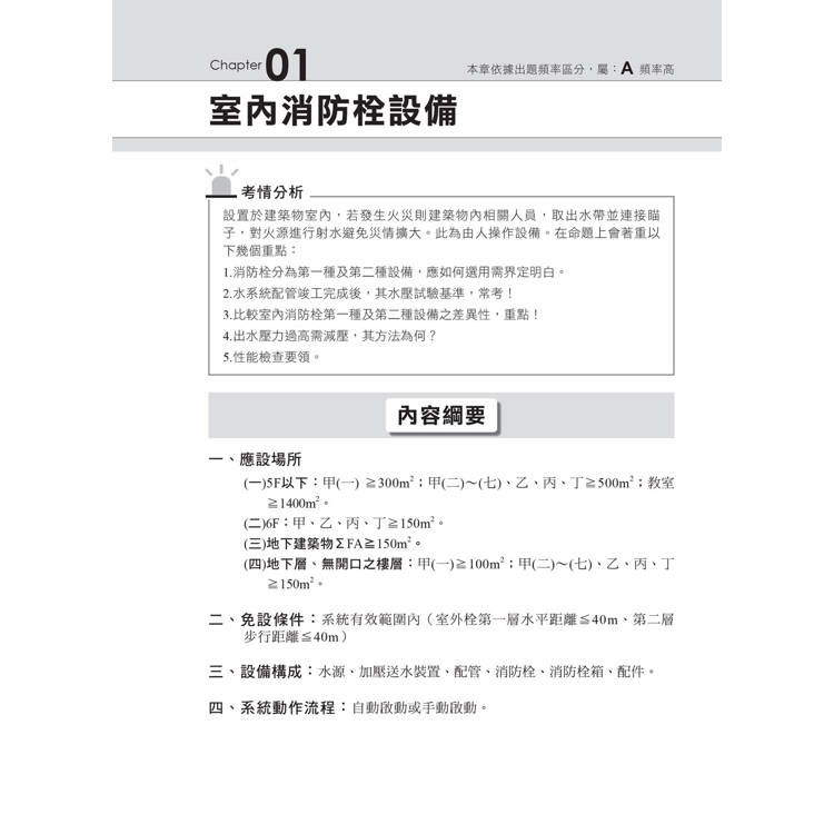 (四)主題式重點歸納整理:將各單元的重要觀念,依教材之邏輯架構整理彙編,簡潔而扼要,可說字字重點。本單元系統架構完整讓你掌握滅火設備精髓所在,想拿取高分應務必熟記。