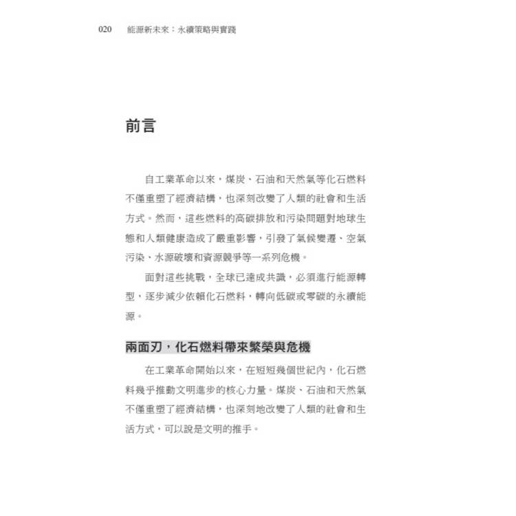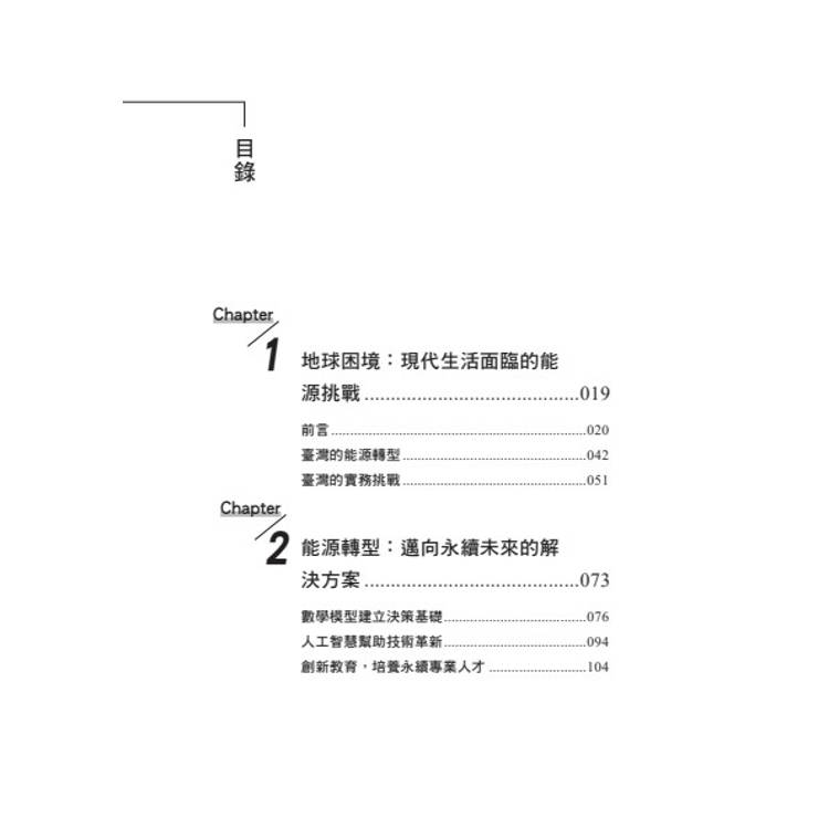 書內從地球困境談起,闡述現代生活對於目前能源轉變所面臨的挑戰,並說明臺灣對於能源使用的現況及實務挑展。