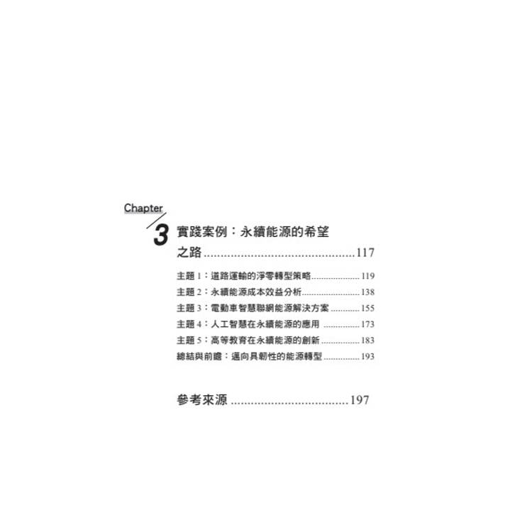 書內更有大量且全方面的能源轉型案例,第三章以五大主題、九個臺灣正在發生的能源實踐與案例,包括:交通運輸、永續能源、電動車智慧聯網、人工智慧、高等教育的創新等,聚焦臺灣當下正在發生的能源現況。最後,更期許臺灣能夠邁向具韌性的能源轉型,迎接新的能源未來。