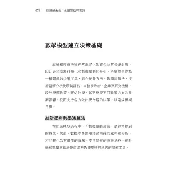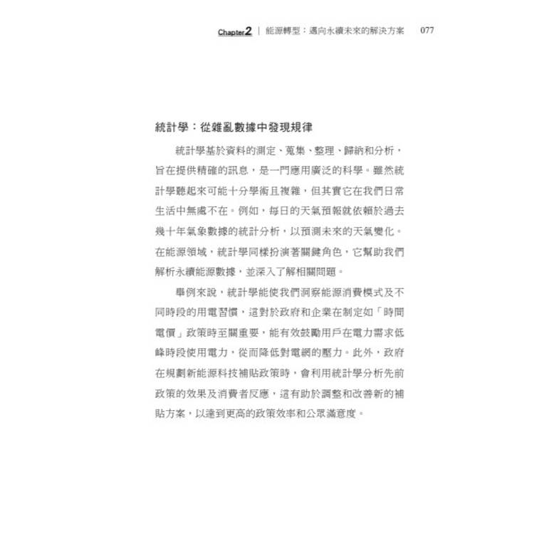 書內結合研究與實務,聚焦五大主軸,包括:交通運輸、永續能源、電動車智慧聯網、人工智慧、高等教育的創新等五大主題,揭示如何以數據為基礎,擘劃能源轉型藍圖,啟動更具韌性與智慧的淨零行動。