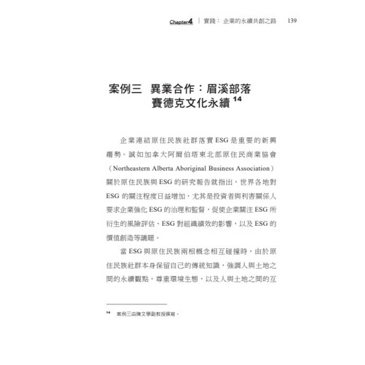 以三個實例為主,分別解析如何靈活應用行動策略,以適應不同需求和挑戰,更透過上述方式讓讀者了解當企業發展到不同階段時,該如何利用組織合作發展的模式來實踐ESG。最後,更期許在ESG 趨勢下的企業家能更達成共創互利的永續之路。