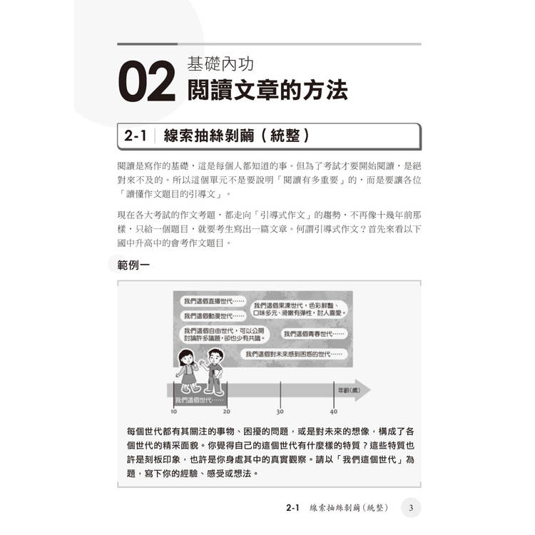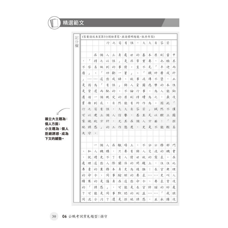 第1章~第5章為基礎教學,先從閱讀、表達、審題等面向說起。有了正確的寫作觀念,即便是面對多元型式作文,也可以迅速在腦中找到素材,並組織出一篇文章的藍圖。第6章~第10章為進階訓練,以實際的國考題目作為範例,每一則範例均含「思考指引」、「架構與內容」、「精選範題」等內容,藉此逐一解說各種題型的應對方式,以及如何構成一篇文章。