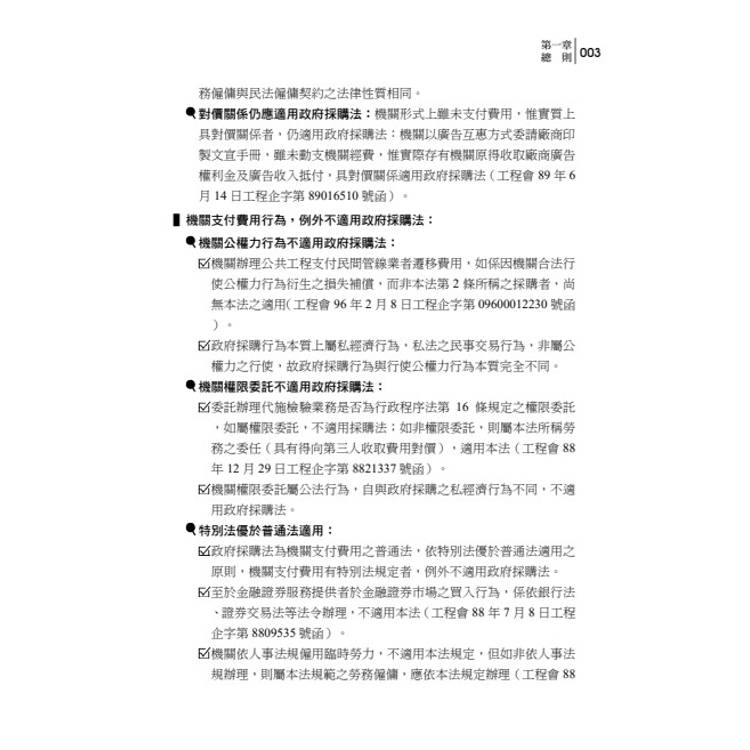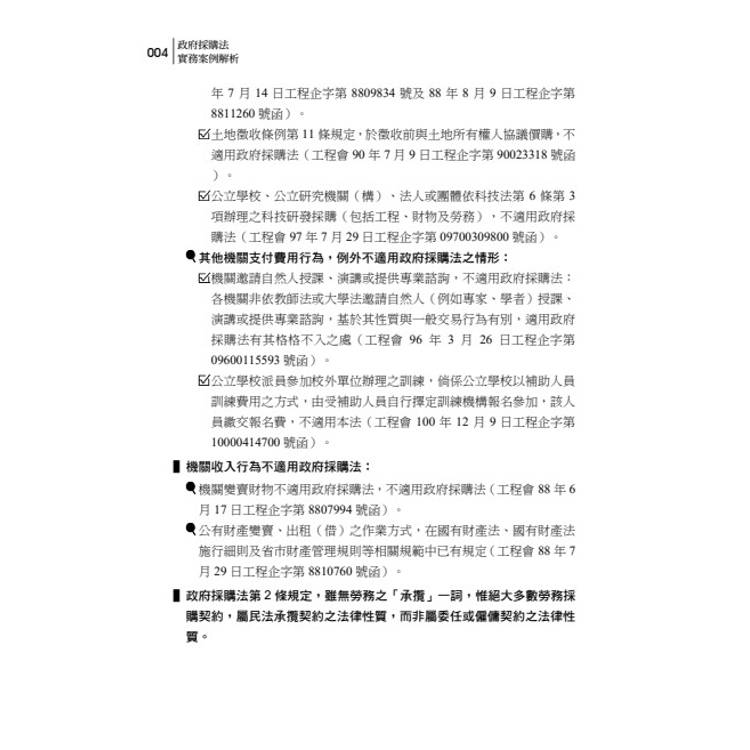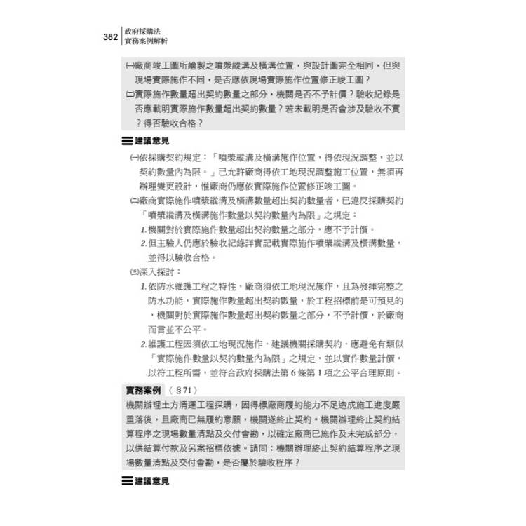 本書專為採購承辦人、審查委員及相關實務工作者設計,透過主題式Q&A索引,可迅速查找常見採購爭議的重點解析,協助在面對契約爭議、驗收糾紛或條款疑義時,快速掌握法源依據與處理方向。結合實務案例與主管機關函釋,讀者能清楚理解法律適用邏輯,提升問題研判與風險管理能力。無論是公部門採購執行、內部教育訓練,本書皆能發揮高效的實務參考價值。