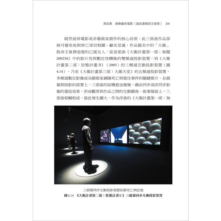 全書分為三部分六章節,採歷史編纂學與影形力的雙軌視域,分析七位藝術家自1970年代以來的影像之作,包括張照堂與陳界仁介於虛實之間的創造;高重黎、袁廣鳴、王俊傑的技術與修辭創新;及蘇匯宇、陳界仁、高俊宏對展映空間與觀眾的測繪,從而建構臺灣跨域影像藝術的新歷史、美學與理論範式。