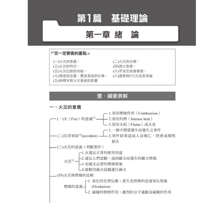 3.重要名詞:解釋火災學在考試上常出現的專有名詞,在寫到「解釋名詞」這一類的考試題型時,往往能手到擒來,對火災學的任一名詞作徹底的解釋。況且本書在此部分所呈現的不是冗長的文字敘述,而是做條列式的整理,專有名詞的定義、公式、相關法令、案例、形成原因、統計數據完整呈現,有條有理,是複習專有名詞的好幫手。