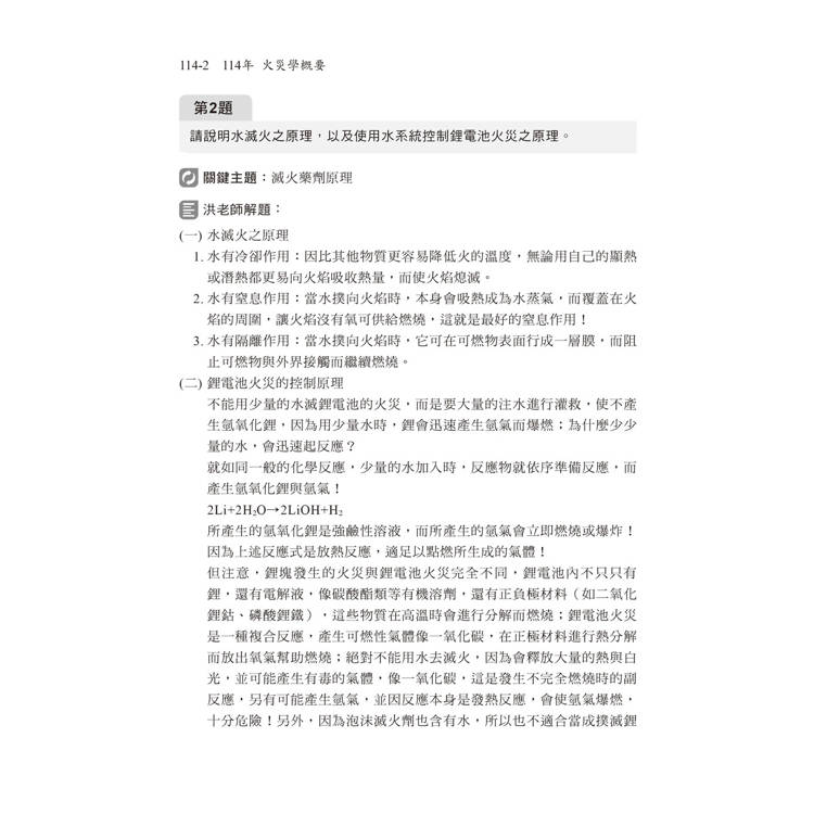 本書收錄消防設備士109~114年歷屆試題,內容包括火災學概要、消防法規概要、警報與避難系統消防安全設備概要以及水與化學系統消防安全設備概要等四科。有效掌握最新考情,鑑往知來,瞭解命題趨勢所在。