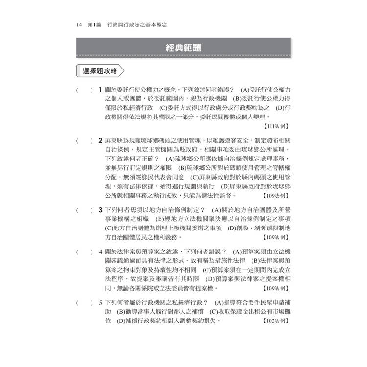 由於「行政法」本身並非一部成文法典,舉凡被劃定為公法範疇之法規,幾乎得作為行政法之法源,包含適用於各個行政法領域之一般行政法,例如行政程序法、組織法、公務員法、爭訟法等,以及適用於個別領域中的特別行政法,例如警察法、財稅法、環境法等。光是要從前面所說內容找出重點,就已經令人頭疼不已。因此,本書的編寫就是要帶你找出最上位之基本觀念,並轉換為常識,這樣就算考題在多變,你也不需要害怕!
