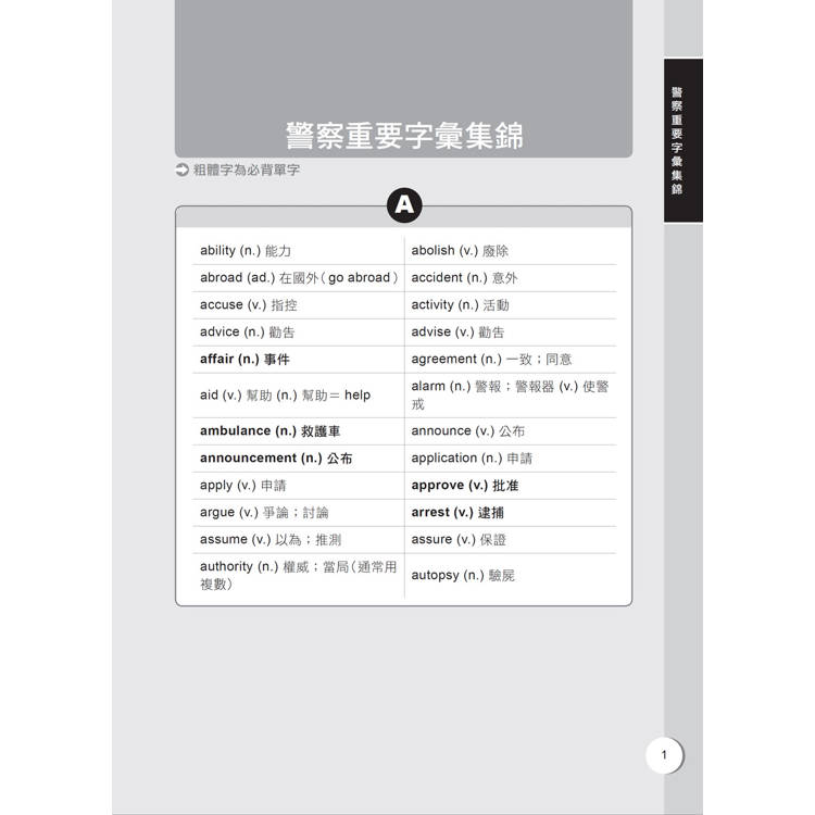 透過重要單字反覆記憶,片語搭配例句學習,來建立英文基礎是必須的,基底打穩才能效率得分。但是,光靠這點是不夠的!想讓實力更上層樓,手邊的秘笈也必須即時更新。《警察專業英文》統整重要字彙以及常考片語,有效增強應試實力;關鍵考點清楚標記,重點一目瞭然。考試重點精準命中,輕鬆登入上榜捷徑!