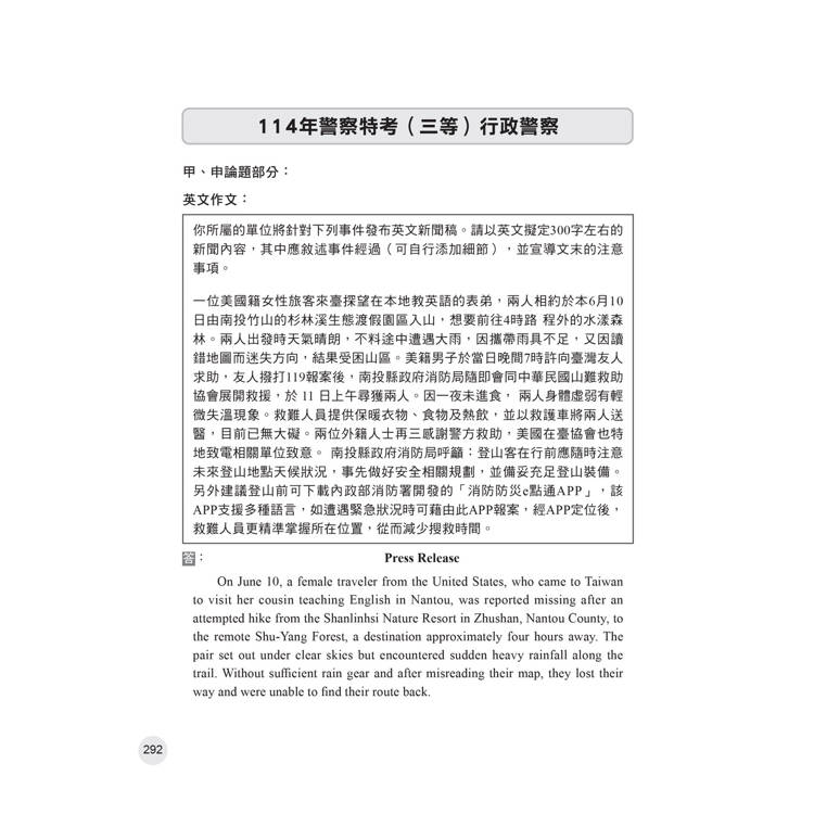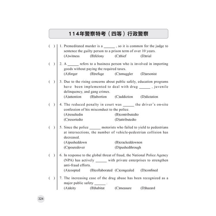 為全面提升公務人員的國際語言能力,強化政府面對全球化競爭時代來臨,95年之後,高普考、初考、司法特考、警察特考等皆新增列考英文一科。觀察以往警察特考的題型,不難發現單字、文法與克漏字選擇、閱讀測驗仍是考試的主題。整體而言,閱讀測驗的比例在試題中占全部考題的50%,可見在未來的公職考試英文中,這類題型必定會層出不窮。