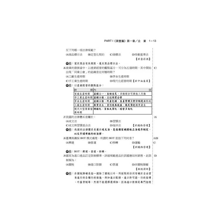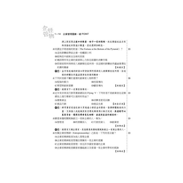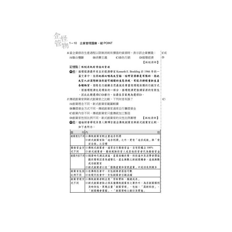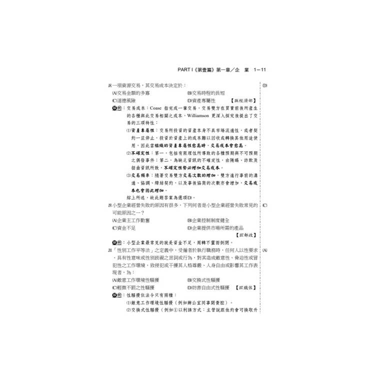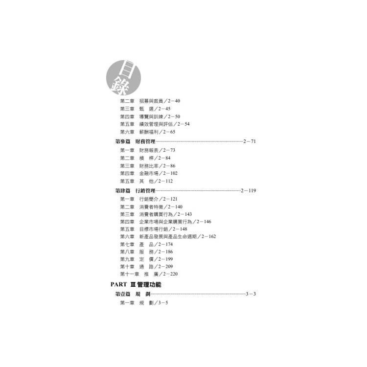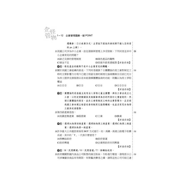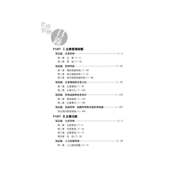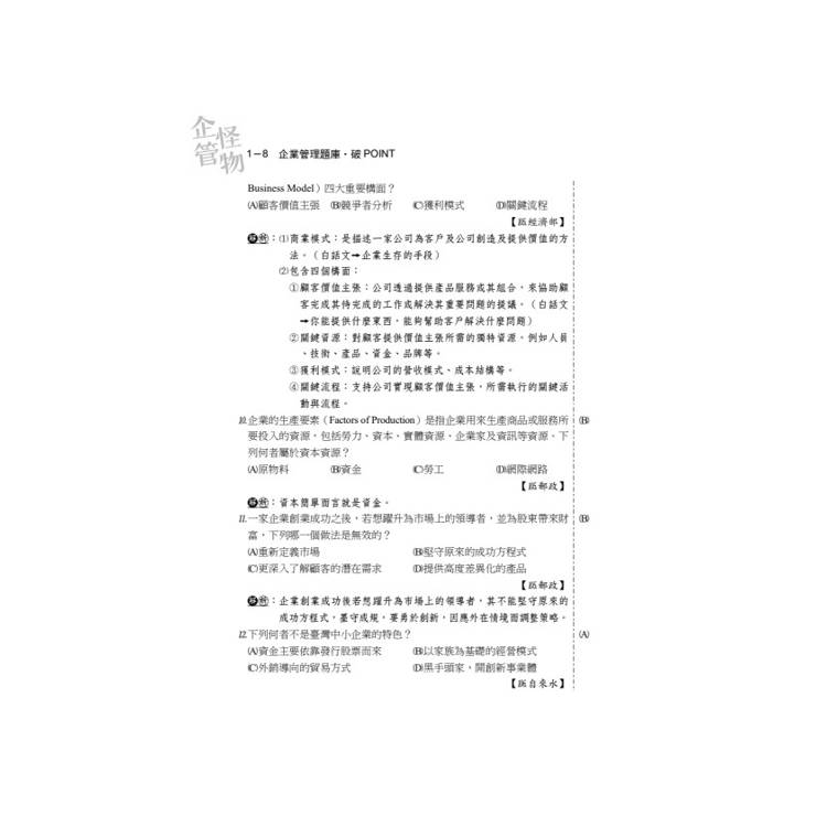 所有企管考試題型(選擇、申論、填充、問答)皆適用。內容將企業管理具代表性的主題綜整並輔以考題解析,加強讀者解題能力。內容主題儘量以「表格」方式整理,讓讀者一目了然。本書為題庫書,重心在於摘錄重點內容並教導讀者如何解題,若能搭配作者的《企業管理(企業概論‧管理學)》一書一併使用,有如虎添翼的效果。