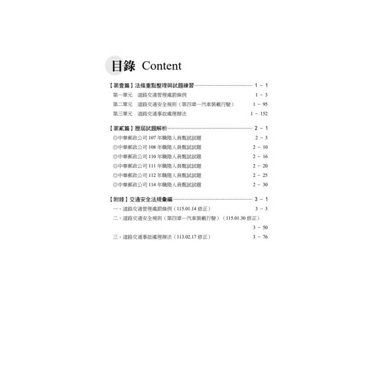 是專為準備郵局外勤人員招考設計的輔助教材。內容針對交通安全常識試題範圍,包含道路交通法規、標誌與號誌辨識、行車安全觀念等重點,並附有題解與實例說明,幫助考生快速掌握出題方向與答題技巧。