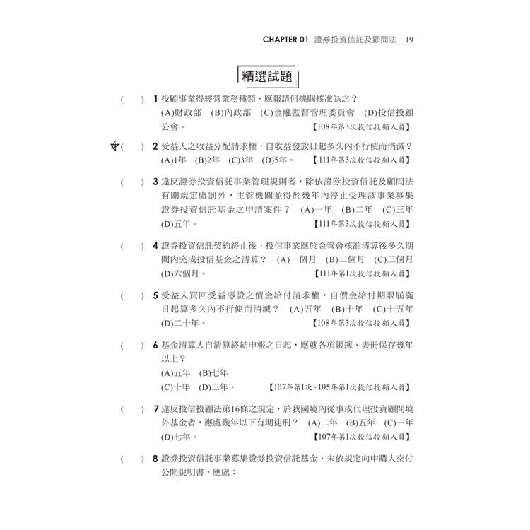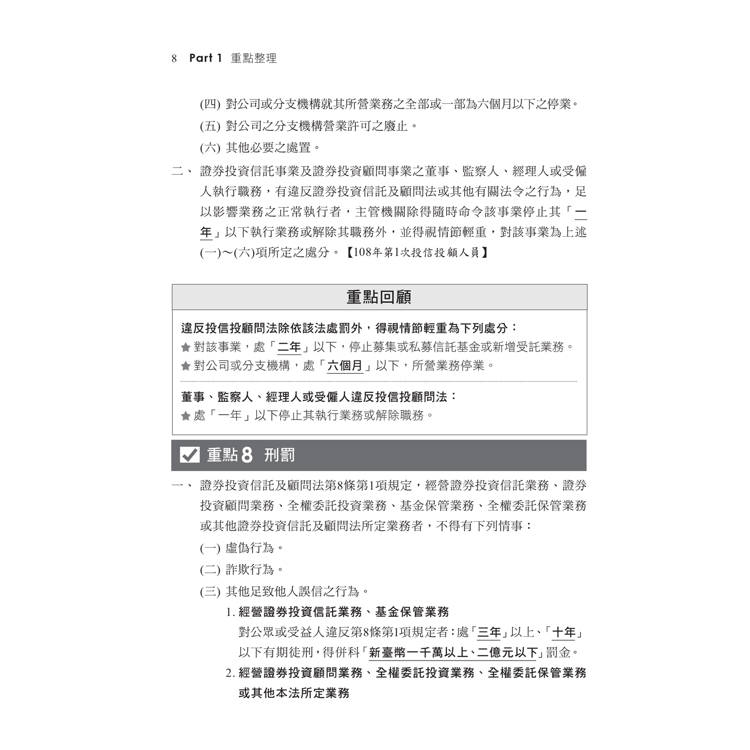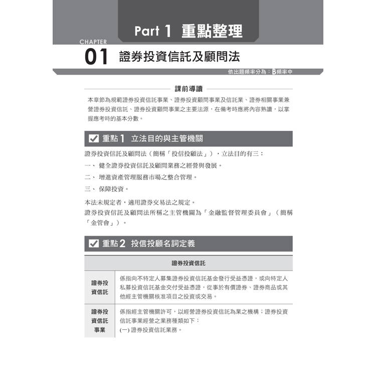 「投信投顧相關法規」因為所論及的範圍十分具體,所以容易考得比較細,尤其是針對行政規定的部分。職業道德規範雖有五個規定,但出題比例僅占百分之十左右,所以要想高分過關,必須掌握行政規定的部分,有鑑於此,本書依照出題的頻繁度規劃小範圍的「小試身手」,藉由小範圍的重點練習增加熟練度,再以中等的練習範圍的章後「精選試題」來加深印象。