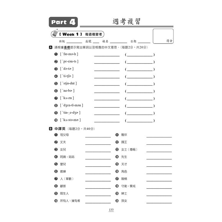 Part 4週考複習(共16週): 133每週複習考(單數週)