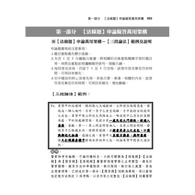 策略為「精要簡薄 不灌水」、「理性編書 不造神」。做法為融入學習心理學、教材教法方法,運用「心像圖」(如圖像式記憶、體系圖、圖表)結合「字鉤法」、「口訣」,協助考生以理解方式記憶「相關法規全貌」、「易混淆、複雜、艱深之理論或法理」,並於附錄促上「各主題字鉤法口訣一覽表」,考生可撕下並隨身攜帶複習,提升長期記憶。
