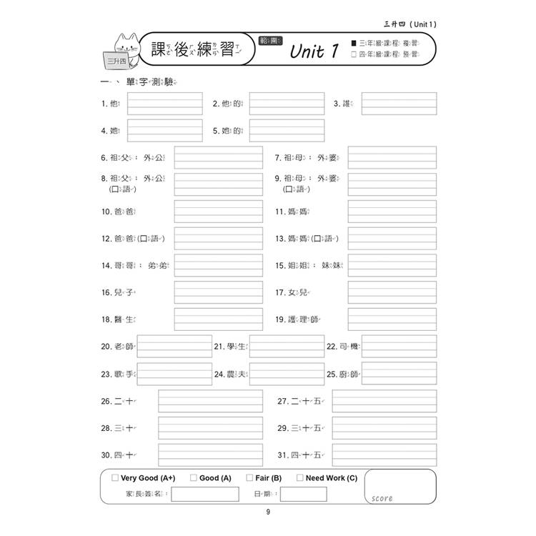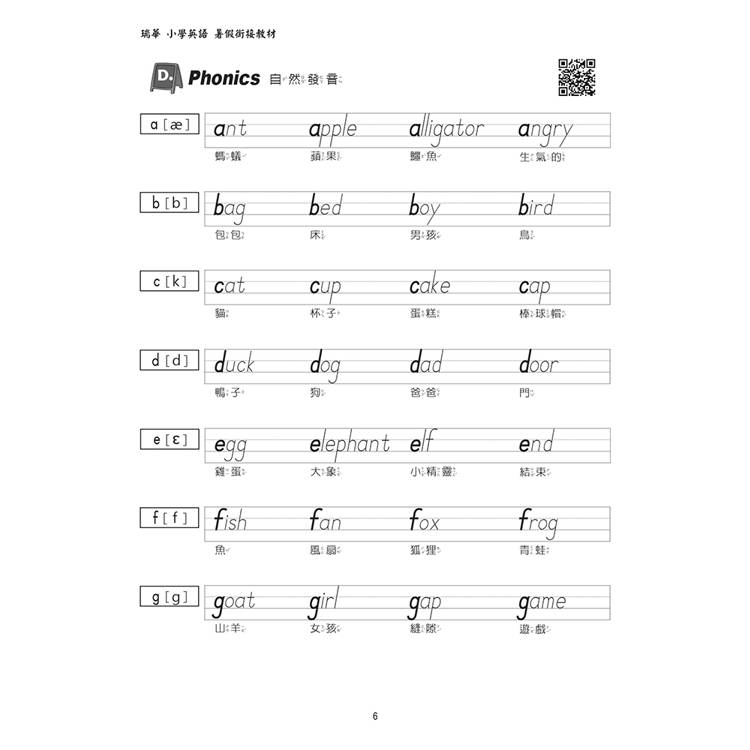 本書的描寫部分,含跨此階段學生應具備的單字、常用句子、生活用語、教室用語,及發音組合單字。
