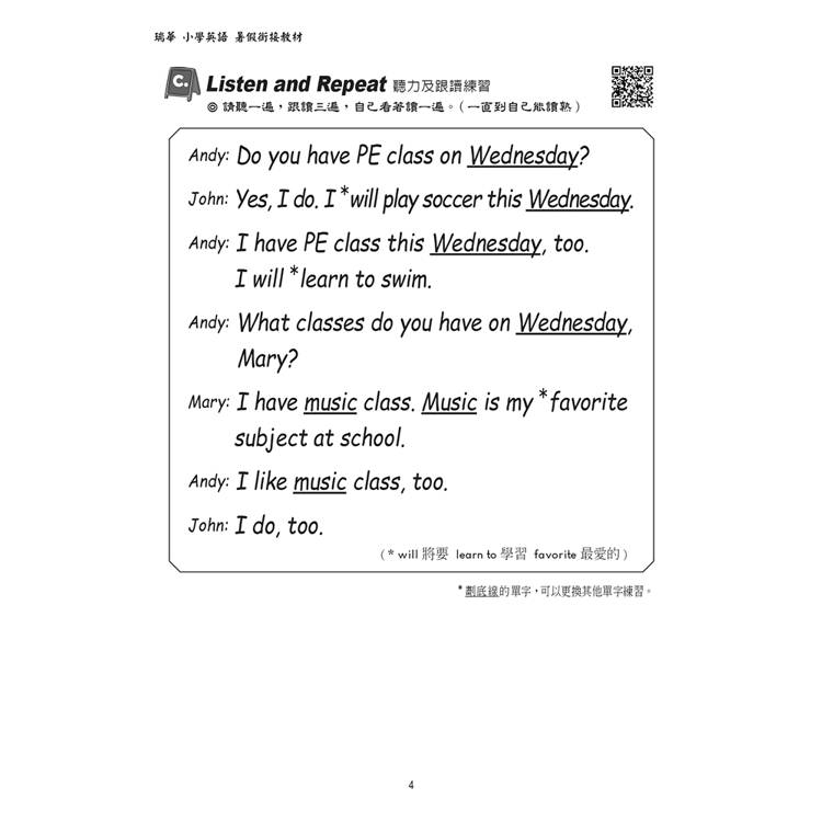 書中搭配對話短文,讓學生實際了解如何運用該句型於生活對話中。