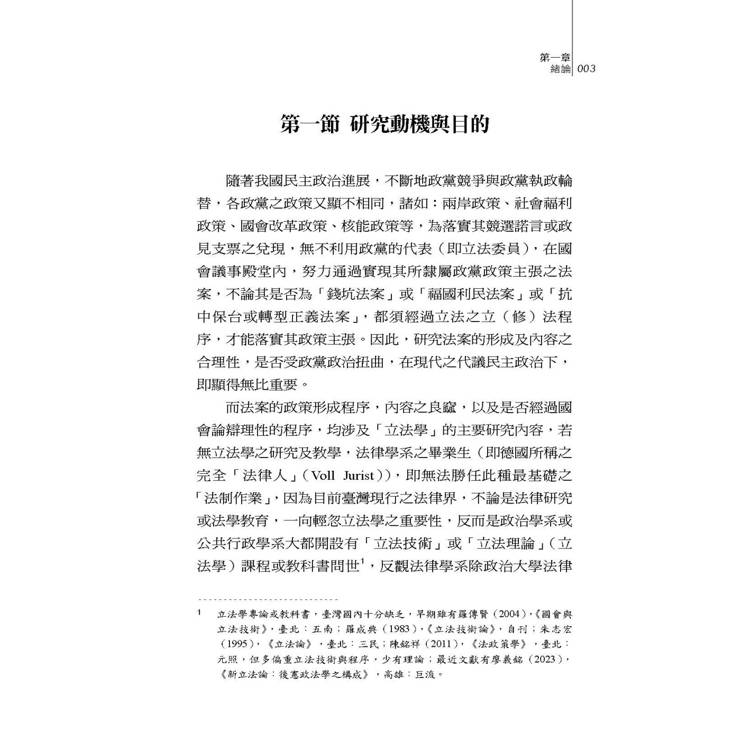 立法學(Lexisprudence)不僅在民主法治國家佔有舉足輕重之地位,而且在民主發展中國家,更是有教育及指引之關鍵性功能,因為國家對人民之諸多管制措施,均源自法令之明文,因此現代化之法治國家,也可以稱為「法律國家」。但是,在台灣的立法學卻未受法學院之重視,國家考試未列為選考科目,師資及教材並不充裕,結果造成法律人僅會操作傳統釋義學,以解決過去發生之法律紛爭,惟卻無法對未來的法律管制內容,提供形成理性、全面及政策之具體文字,變成一個半殘缺的法律人,再加上台灣最近的立法或修法,均充滿政治力大量動員之現象,過度政治化的法律修改,諸如:財政收支劃分法及憲法訴訟法……等,除造成朝野尖銳對抗外,也使社會氛圍焦慮不安、遑遑不可終日,似有待立法學之理論力量,以匡正此種社會重大危機。