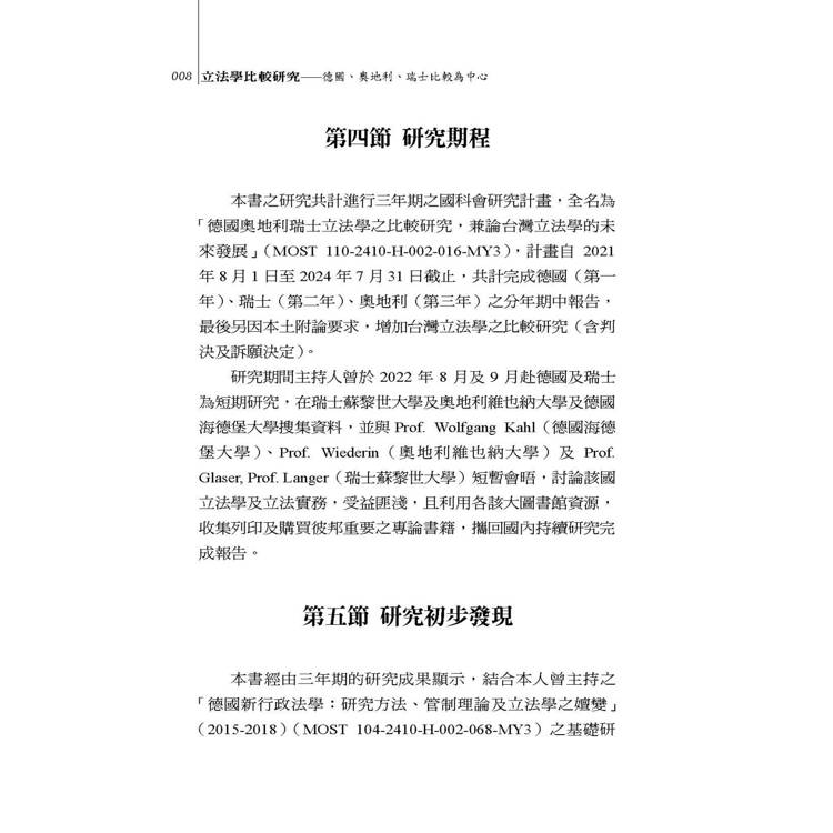 本書乃典型之比較法學論,利用國科會之三年期研究計畫(MOST 110-2410-H-002-016-MY3)支助,赴德國、奧地利及瑞士三個德語系國家或地區,進行實地研究,分別於維也納大學、蘇黎世大學、海德堡大學及法蘭克福大學進行短暫研究及交流,最終期末報告乃結印成書,希望能夠為台灣立法學的未來發展,略盡棉薄之力,使得不論是國會立法或地方自治團體(議會)之立法均有成規可循,不至於高度政黨動員,形成諸多不理性的法律,禍害全國。本書除受國科會補助外,另經二位匿名審查人之實質審查,提出諸多改善意見,有助於本書之精進改良,併此致謝。臺大法律學系參與計畫之碩士班研究生陳思儒、張桂華、端木瑞瑩、朱雲生、林晴雯、洪品毅、林書緯、戚雲珽、董道心、陳紀瑋及何蔚慈同學之協助繕打、更正及提出諸多改善建議,使本書更臻可理解性,也要再度感謝我這一群優秀傑出之助理。希望皇天不服苦心人,這一本小小的立法學比較研究專書,能給臺灣的學術界,帶來更深刻的討論素材或授課之教材,也是作者的深深期待與期望。