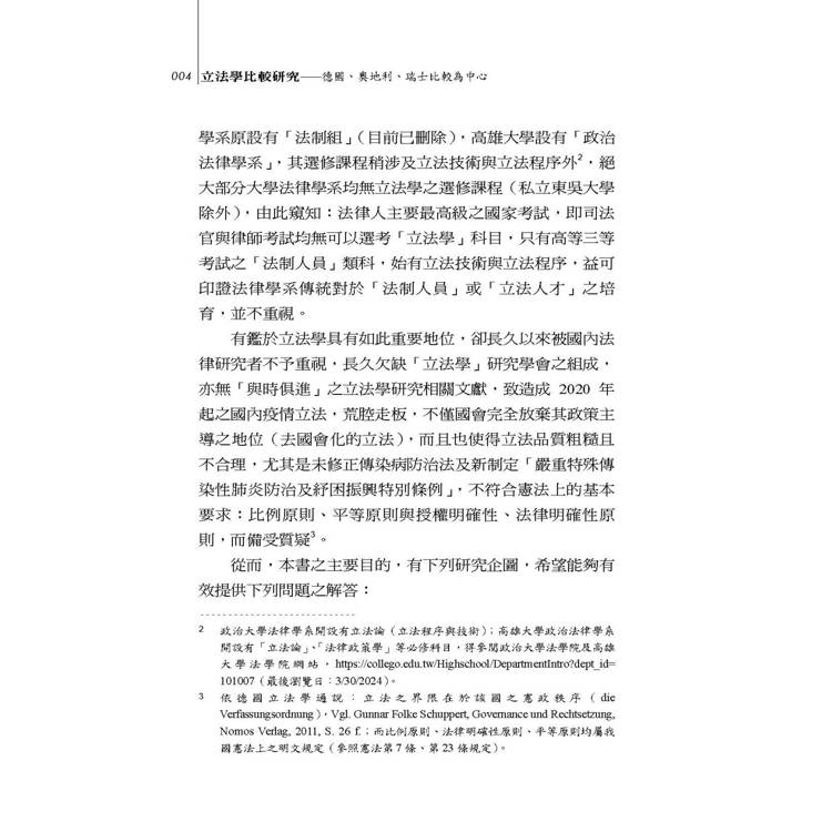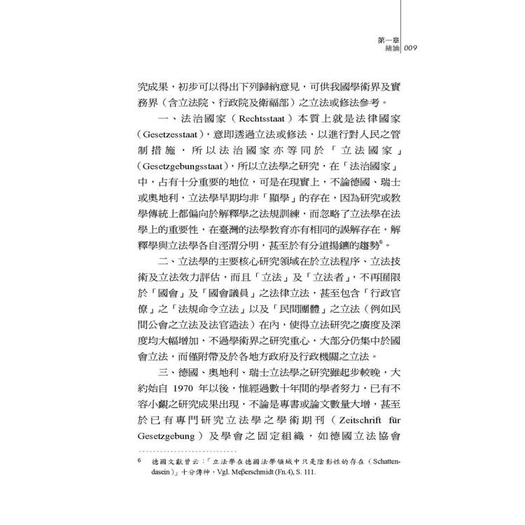 臺灣有關立法學之討論書籍已有不少出版者,惟從比較法及法學觀點進行討論專書,則較為罕見。本書從德國、奧地利及瑞士立法學之視角出發,並檢視我國立法現況與缺失,故可作為實務工作法務人員及法學研究者之參考,以落實法治國家的理想目標。