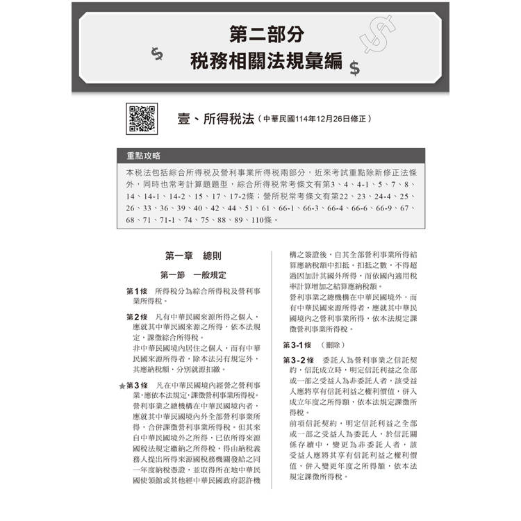 內文有小叮嚀視窗與必考內容標示,讓你一眼就知道重要考點,法規部分則貼心整理「重點攻略」,提醒你各個法規的常考條號,搭配法規QR Code使用,輕鬆掌握法規更新動態。
