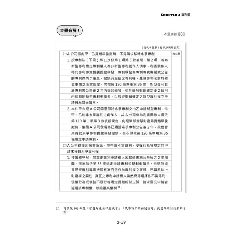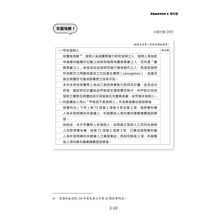 本書的設計理念,是希望讀者不只是「看懂題目」,更能「學會作答」。在有限的時間內,以清楚的層次與恰當的篇幅討論各爭點,往往決定分數高低。因此應在審題時就先擬定好答題的層次順序,以及各層次中要討論的問題及其篇幅,才可從容地在答題時間內打到每題的爭點配分。
