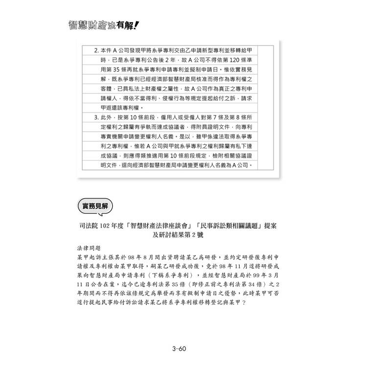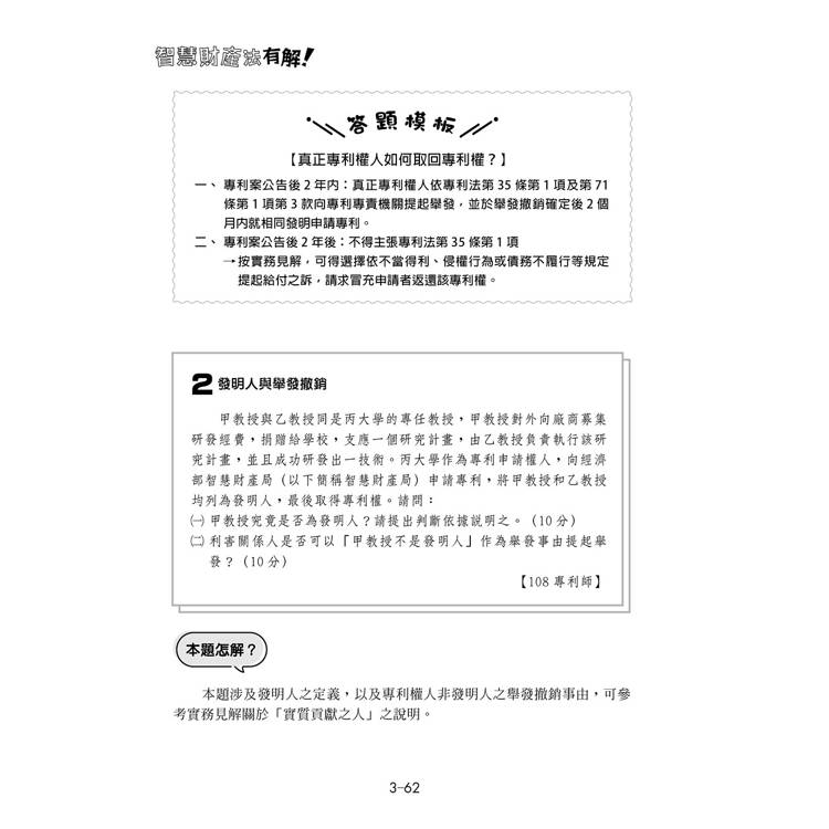 早在校園求學期間,筆者就對於智慧財產法有著濃厚的興趣。進入實務工作後,也有幸參與了各類智財案件。編寫本書的初衷,希望能將過去備考的經驗分享給讀者,減輕讀者在準備該考科的繁重壓力。智慧財產法的考科範圍廣大,包含著作權、商標、專利及營業秘密四大領域,內容繁雜而常令人望而生畏。為能讓讀者更高效地利用有限的時間,本書精選並集結了律師、司法特考、高考三等各類具代表性的考古題,力求涵蓋所有核心爭點,透過實際試題的演練,讀者不僅能快速掌握各科重點,亦能掌握相關學說及實務見解。