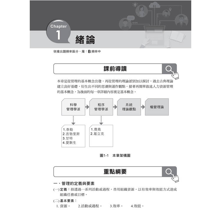 每章在編排上依序由課前導讀、重點綱要等逐一展開。希望對於不具備基礎概念或已有豐富人資經驗的讀者來說,都能迅速上手,輕鬆閱讀。