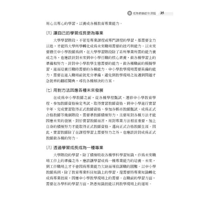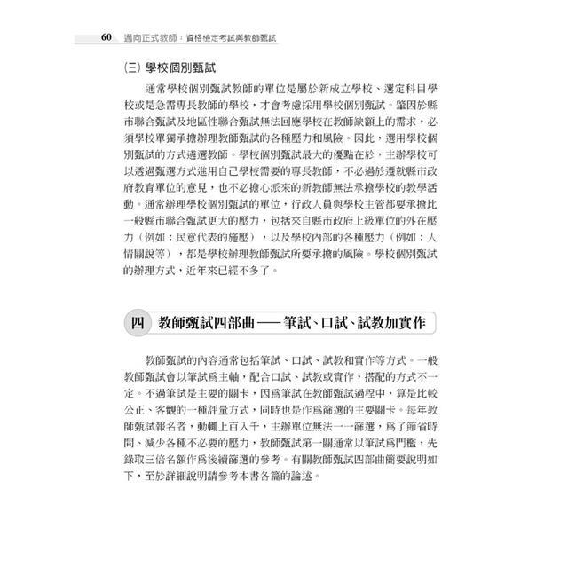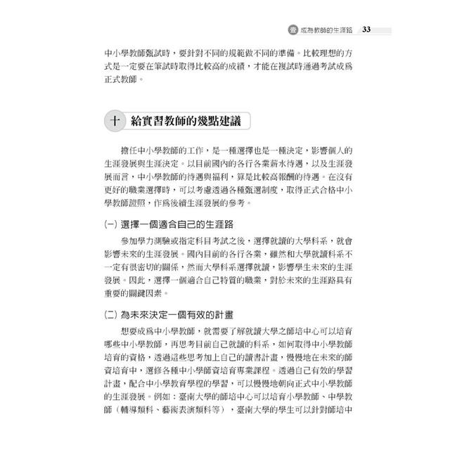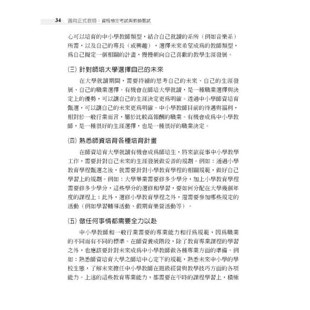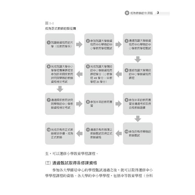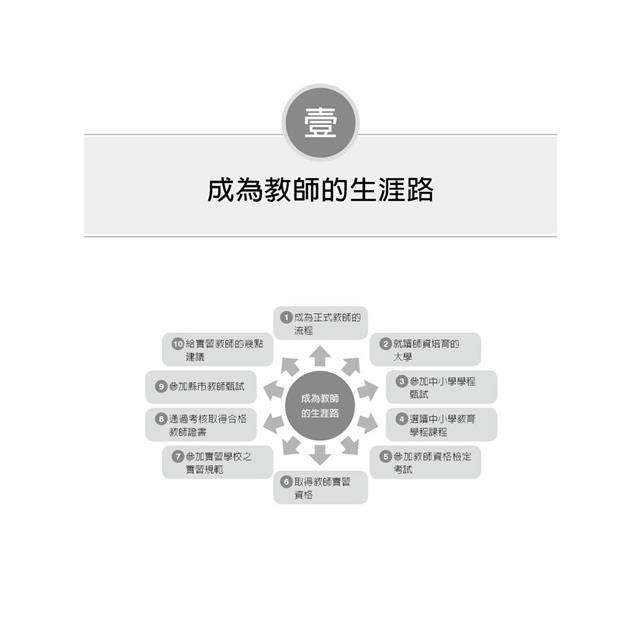*本書的內容包括四個主要部分,依序為成為教師的生涯路、教師資格檢定考試準備篇、教師甄試考試準備篇、邁向正式合格教師生涯。