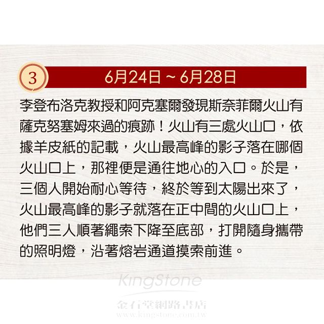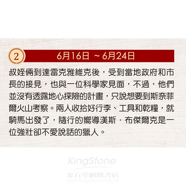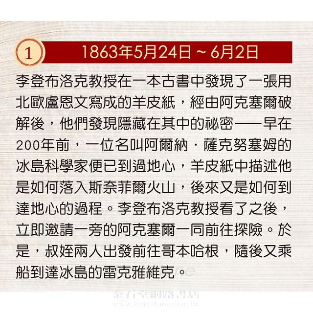 李登布洛克教授受好奇心驅使,來到冰島準備展開一場地心探險之旅,三人依照文獻記載進入火山,漫長的旅程中面臨食物不夠的危機,還遭遇迷路、羅盤失效、巨 石的阻礙等困難!這位好奇心永遠得不到滿足的科學家,他的執著將為他帶來怎樣的探險經歷?本書延伸閱讀特別介紹探險時應攜帶的裝備,以及教您如何破解神祕 又古老的盧恩文密碼!無論如何,有了這張地圖,您也可以來一場驚險刺激的地心冒險,並且能輕易找到回家的路!