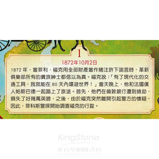 菲利.福克帶著僕人帕斯巴德,展開一場為期80天的環球之旅,旅途中驚險不斷,不但遭遇火車停駛、與印第安人打鬥等各種災難,甚至還有一名警探窮追不捨, 從中阻撓!面對充滿未知的旅途,福克要如何通過重重阻礙?這場看似不可能的賭注又該如何贏得呢?讓我們跟隨菲利.福克的腳步,一同到訪未知的城市,展開 80天緊張又刺激的紙上環球之旅!