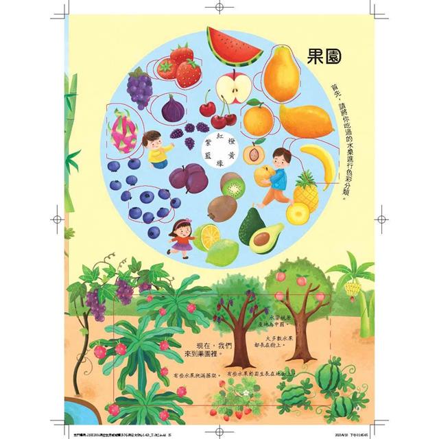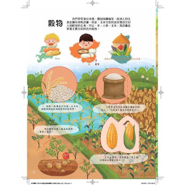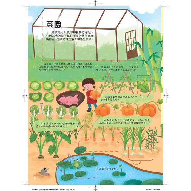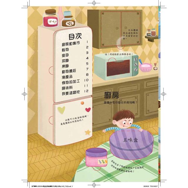 在廚房,在市集,在田地,在農莊,在海上,能獲得哪些食物?穀物、糕點、堅果、蔬菜、肉類等美味的食物,琳瑯滿目。蛋糕是如何製作出來的?優酪乳和牛乳一樣嗎?哪些食物有營養?哪些不能吃?都在互動翻頁時得到答案。