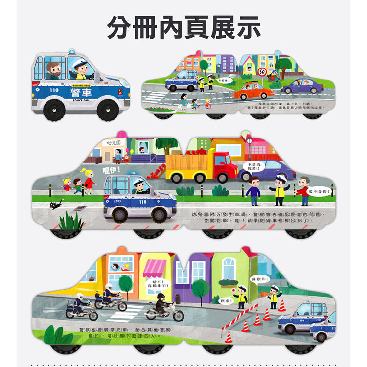本系列共有小朋友最愛的警車、消防車、垃圾車、救護車,每本書下面都有順滑有趣的車輪,讓喜歡車車的孩子愛不釋手!除了認識交通工具之外,同時也能在遊戲中培養閱讀的好習慣,在玩樂中學習!