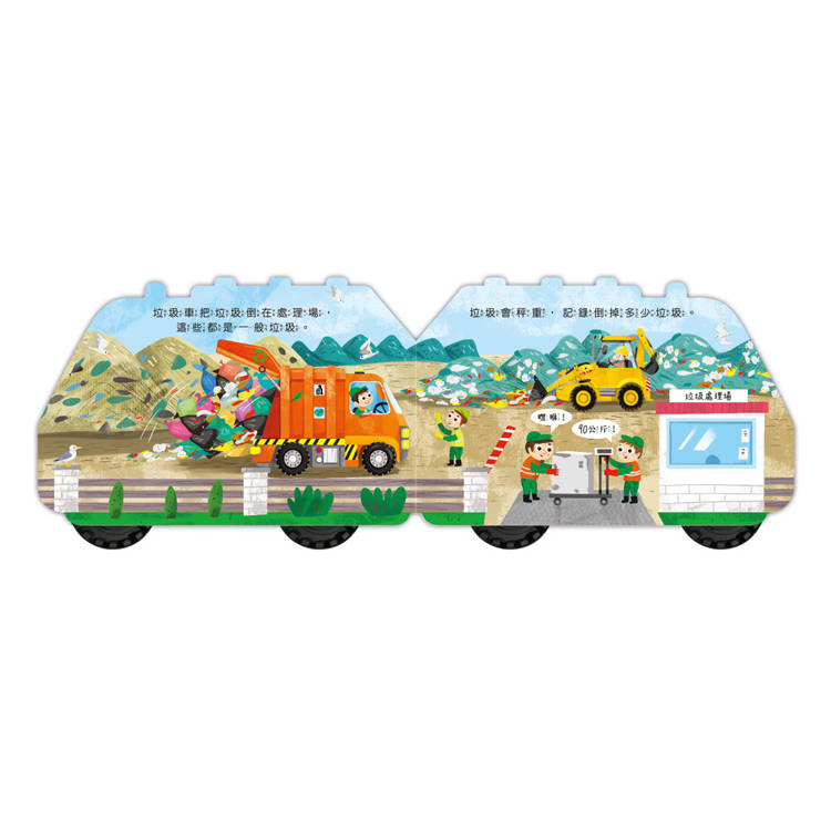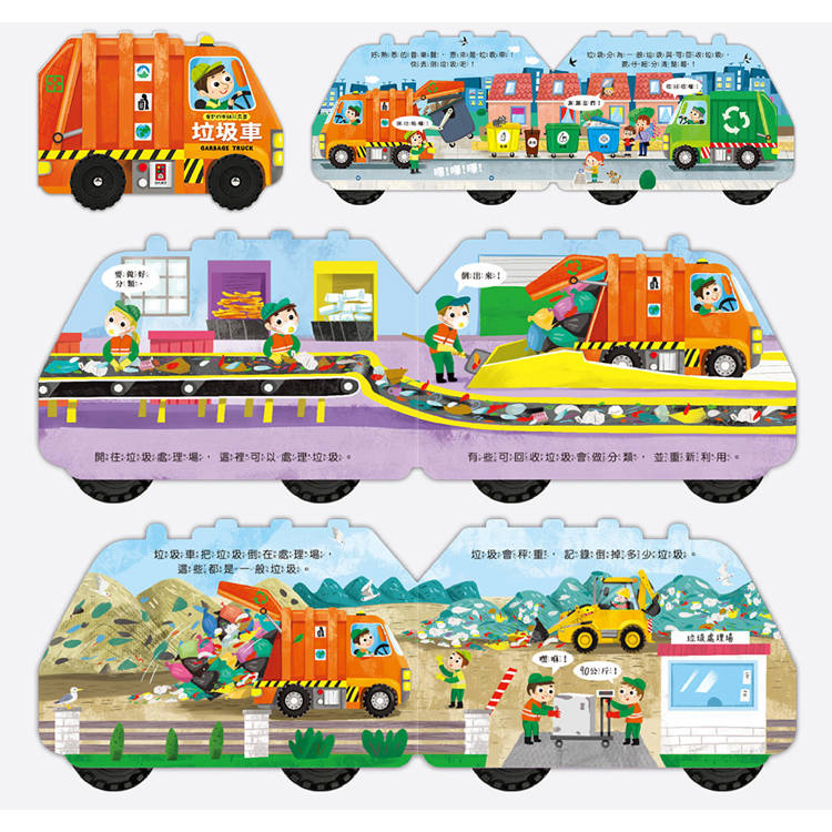 《會動的車輪玩具書──垃圾車》熟悉的音樂聲響起了,原來是垃圾車來了!一起來看看垃圾車平常會做什麼事情吧!。