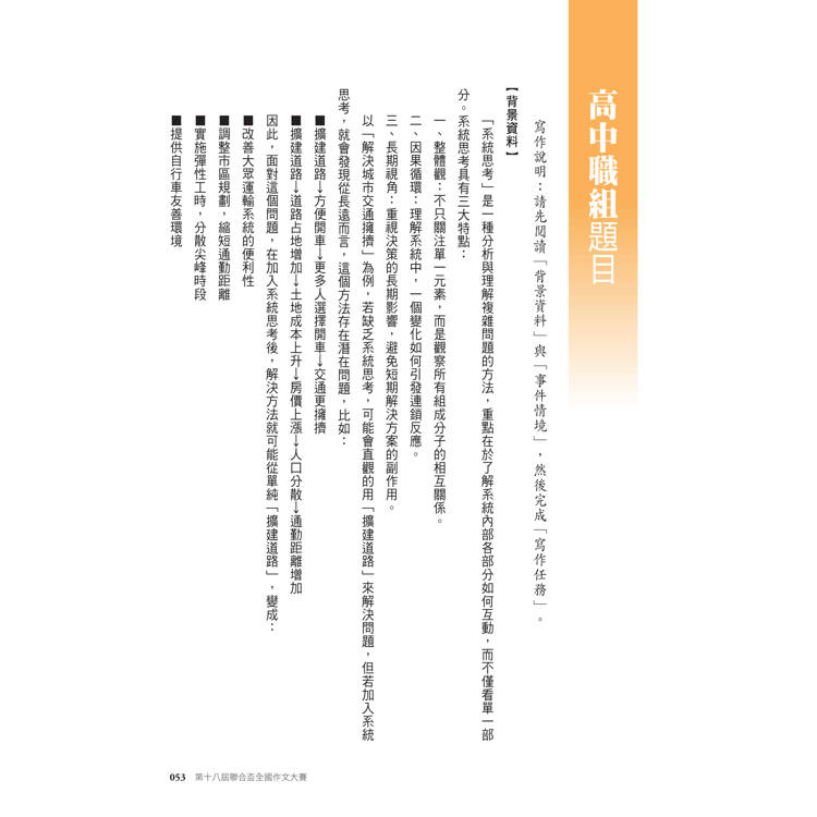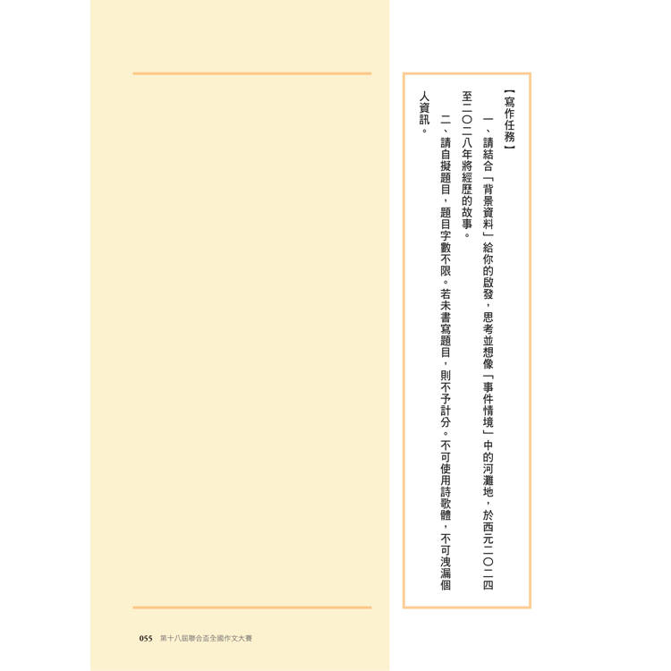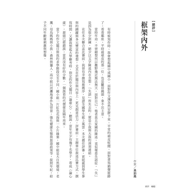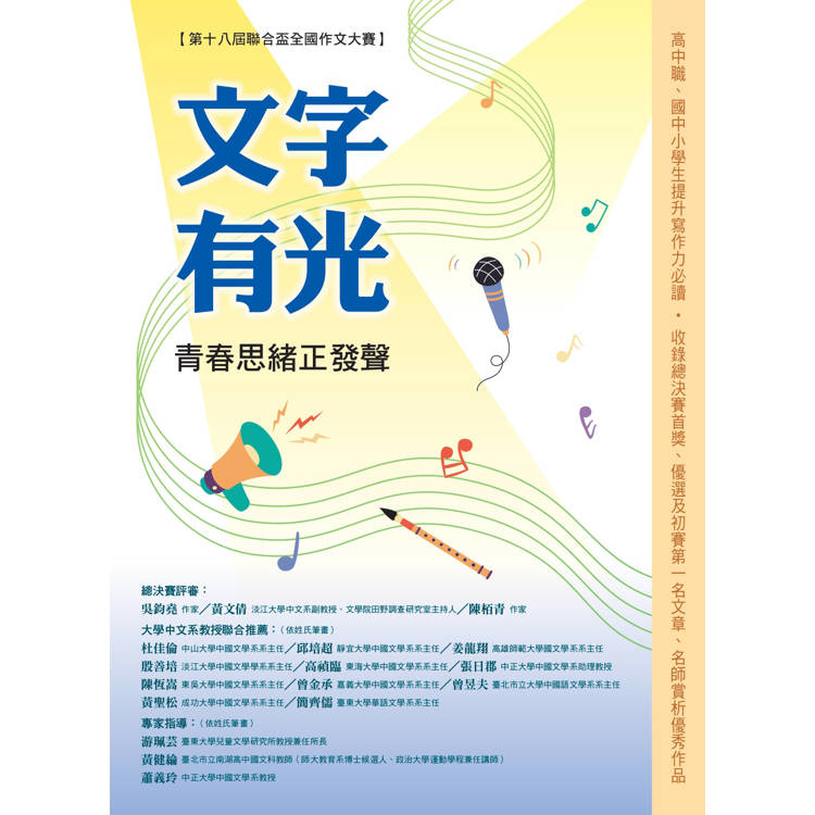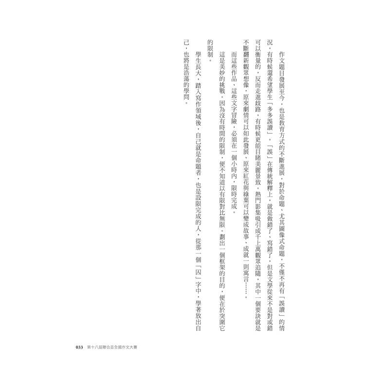 本書收錄第十八屆聯合盃全國作文大賽總決賽首獎、優選及各區初賽第一名文章。