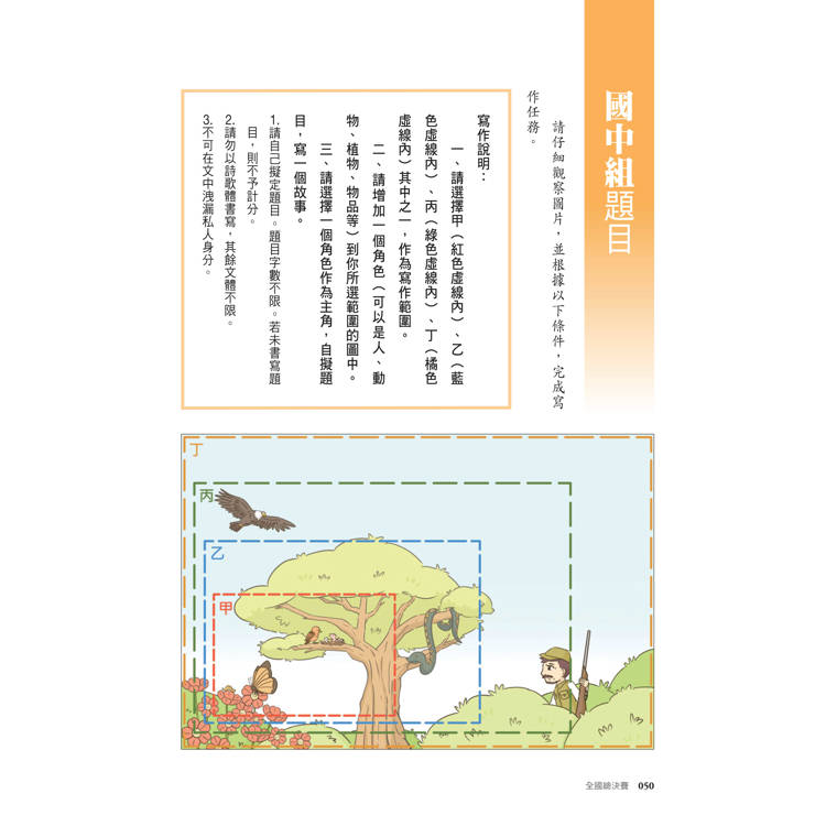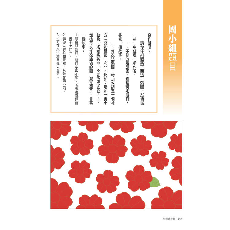 當下的作文題目與我的求學階段完全不同,國小組一片紅色花海與一小片綠葉,國中組是大自然環境,老鷹、母鳥媽媽與小孩、森林與獵人,高中組以河灘地事件為背景,強化健康生態與旅遊政策等,按照年紀,給予不同年齡層刺激與想像。