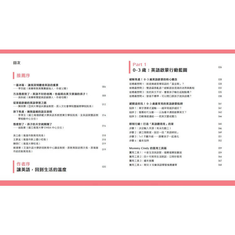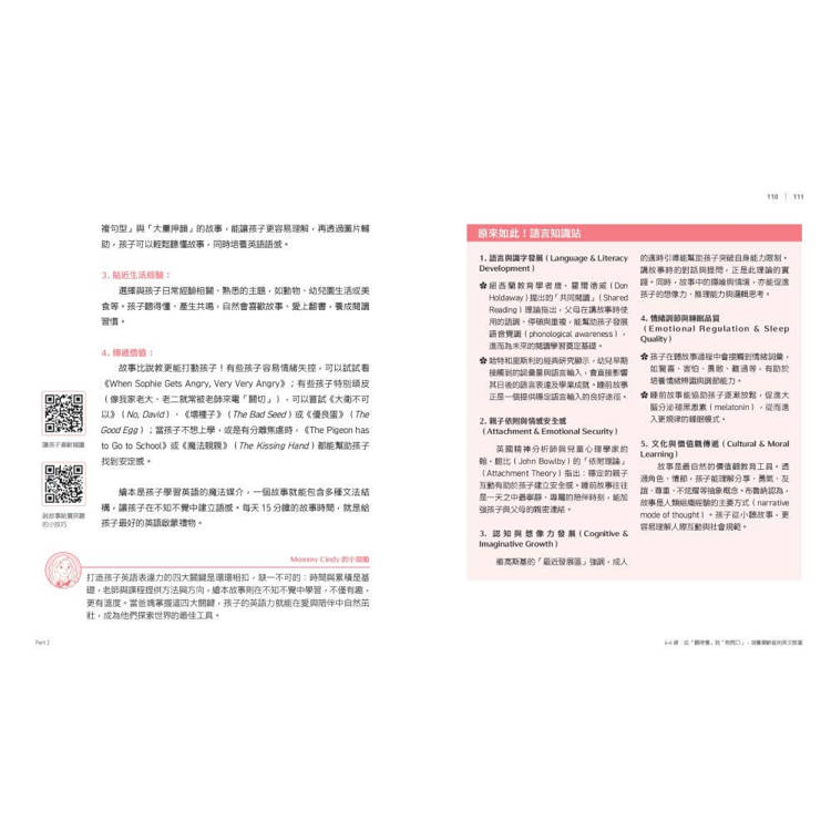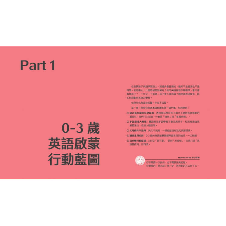 在這本書裡,我特別規劃了兩個非常重要的板塊:「原來如此,語言知識站」與「Mommy Cindy 的實用工具箱」。前者提供家長不可不知的正確觀念與科學依據;後者則提供家長能立刻和孩子互動的實用方法。兩者相輔相成,讓家長在理解原理的同時,也能馬上帶著孩子一起做、一起玩、一起開口說英語。
