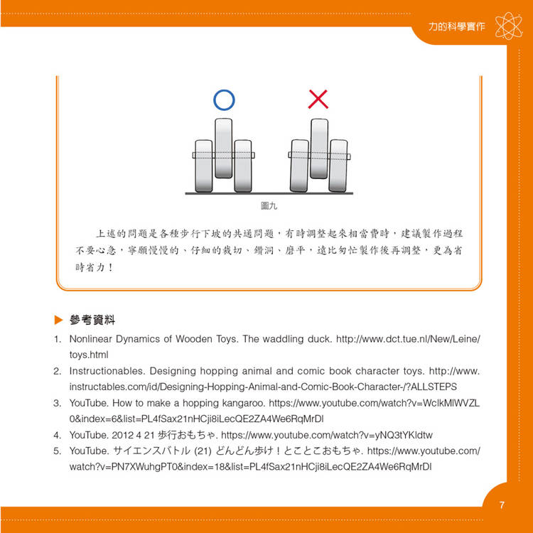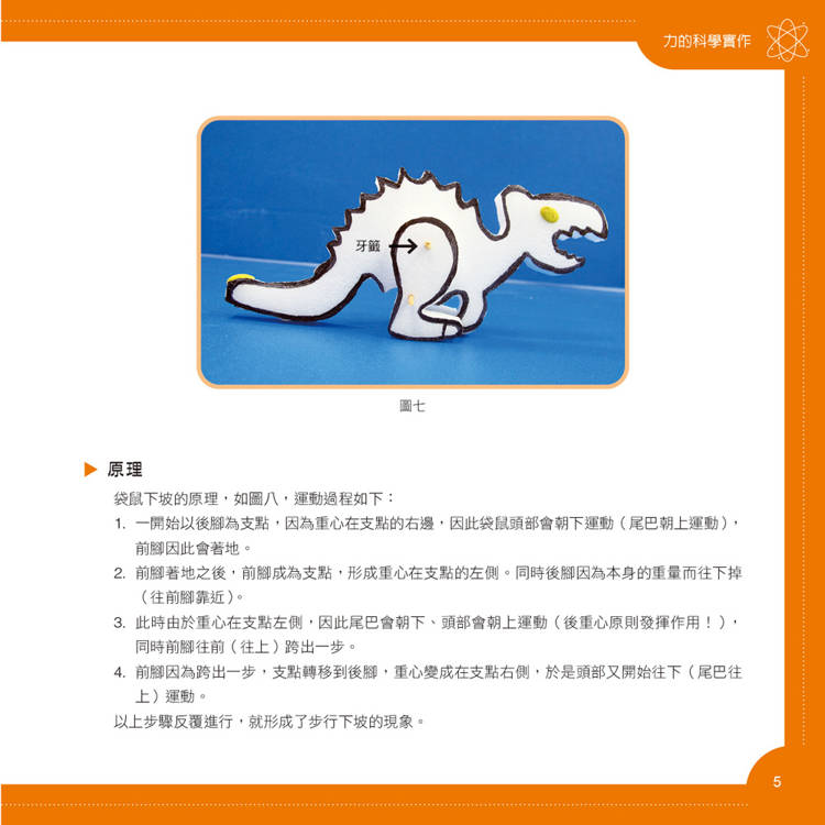 「步行下坡」(ramp walker)是相當古老的玩具,有相當多不同形式的設計,本書一開始六項就是介紹各式各樣的下坡玩具。首先如圖一的木製袋鼠,沒有外加動力,放在斜坡上不會滑下來,而是前腳、後腳交替的步行下坡,相當有趣。