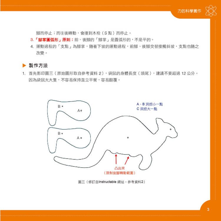 1. 首先影印圖三(原始圖形取自參考資料2),袋鼠的身體長度(頭尾),建議不要超過12 公分。因為袋鼠太大隻,不容易保持直立平衡,容易翻覆。