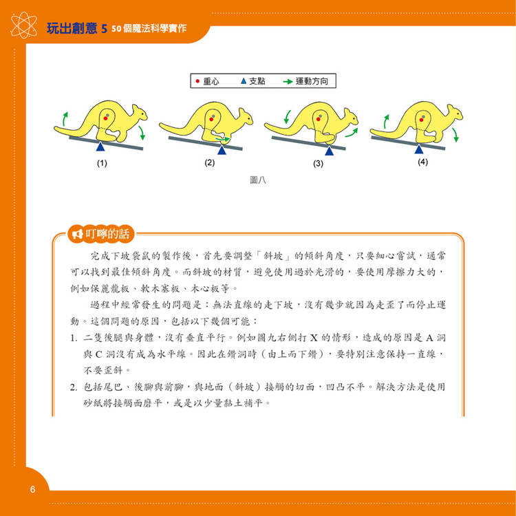 完成下坡袋鼠的製作後,首先要調整「斜坡」的傾斜角度,只要細心嘗試,通常可以找到最佳傾斜角度。而斜坡的材質,避免使用過於光滑的,要使用摩擦力大的,例如保麗龍板、軟木塞板、木心板等。