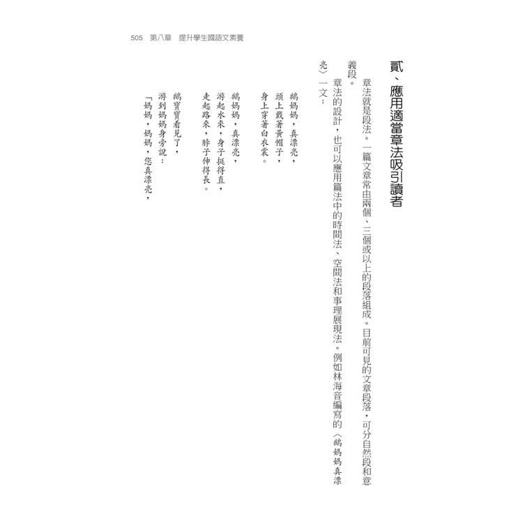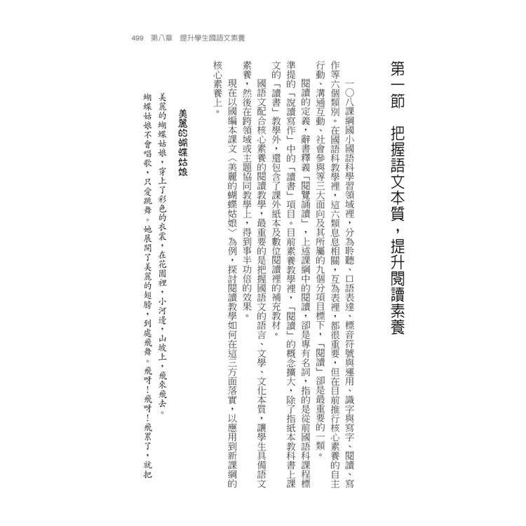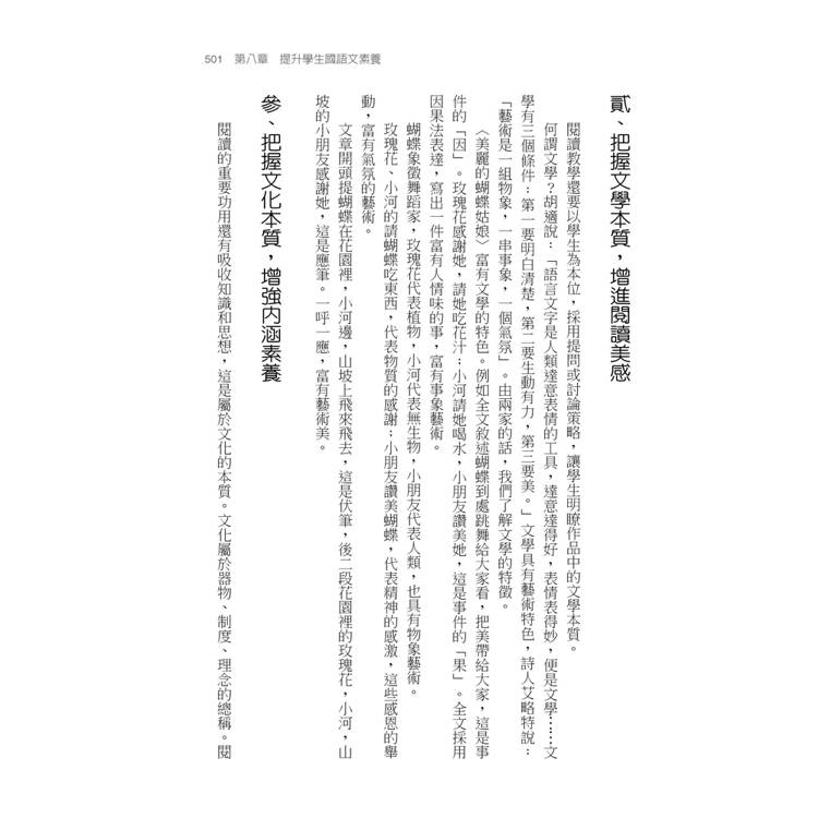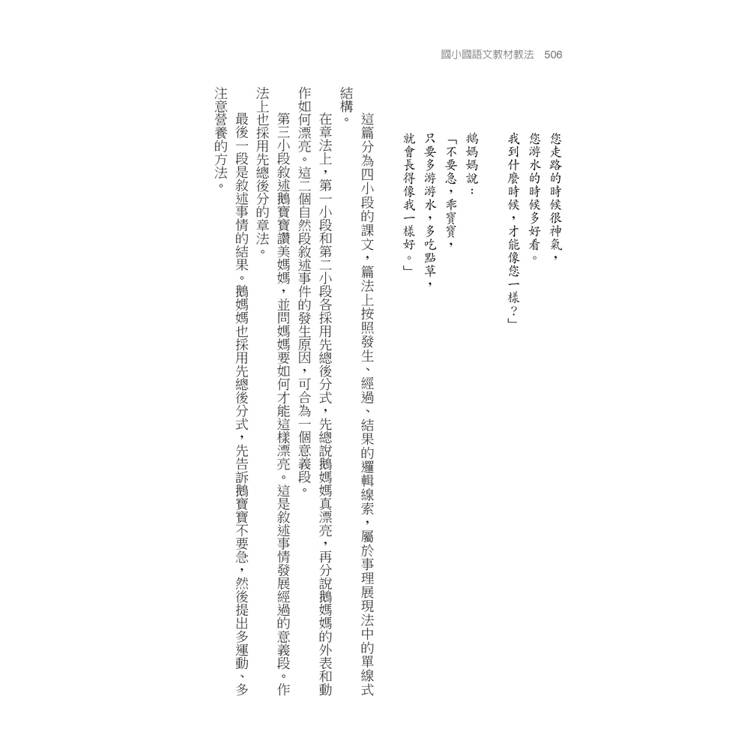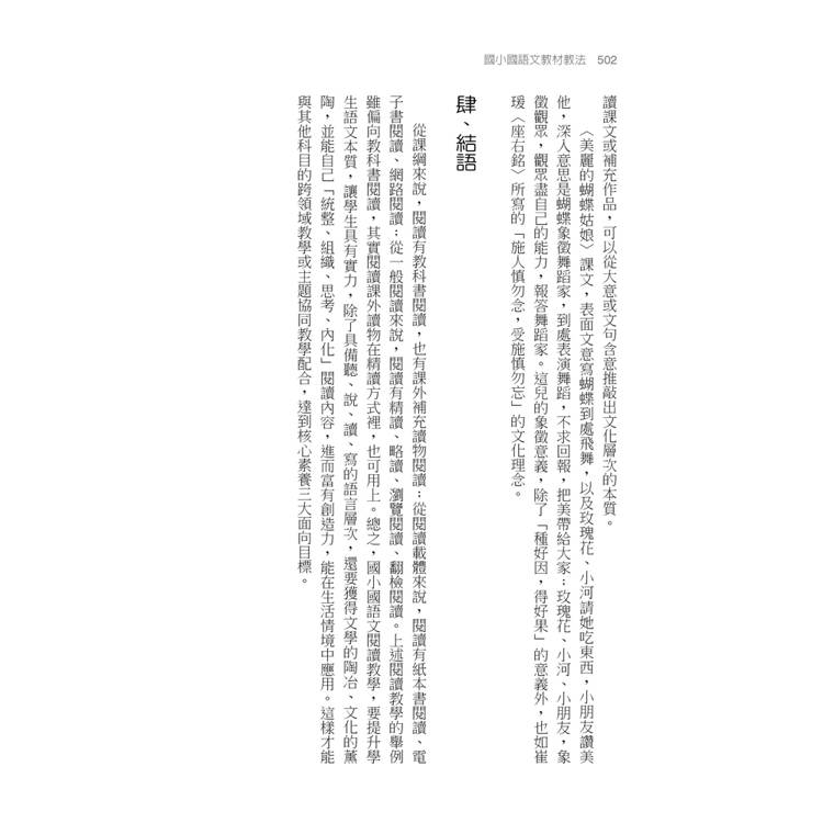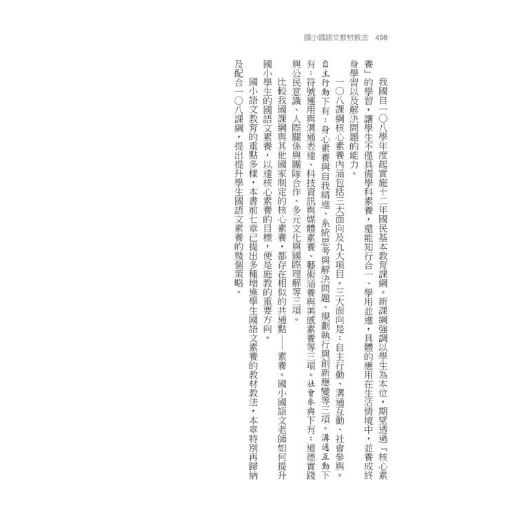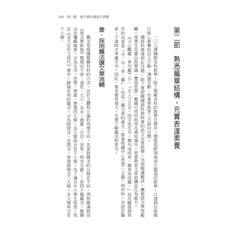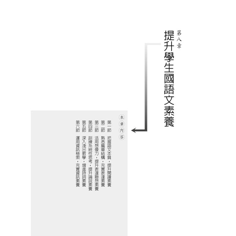 本書共有八章,第一章為緒論,總論國語文教學的原理原則、方向、範圍、與方法;第二章至第五章,深入分述國語文的拼音、閱讀與寫字、聆聽與說話、作文等的理論與教學法;第六章配合跨領域及主題教學,提出「表達、溝通與分享」的應用方法;第七章則為國語文教學評量的命題原則及技巧;第八章則配合108課綱提出提升學生國語文素養的策略。