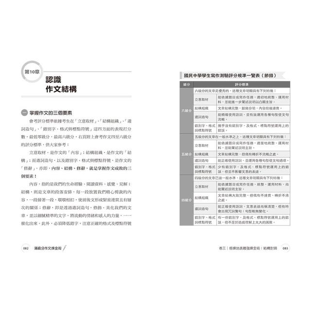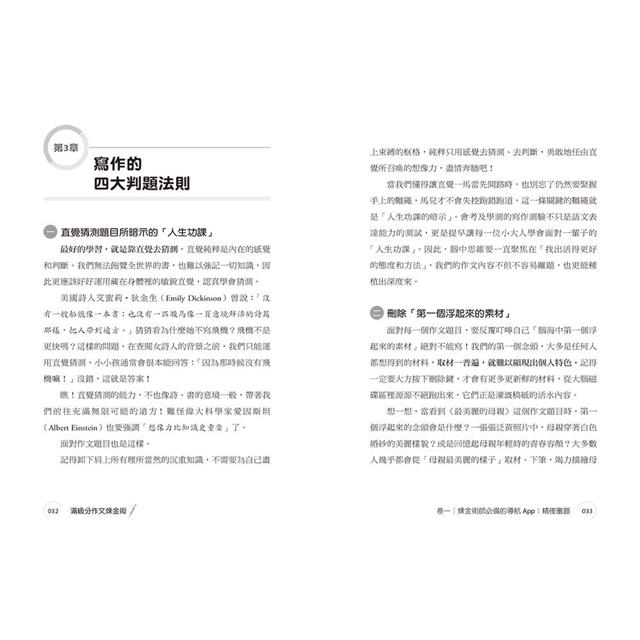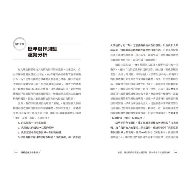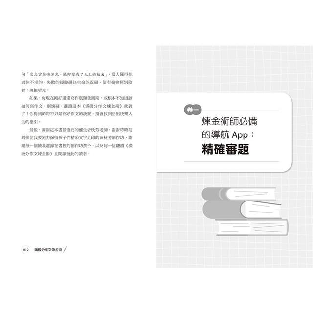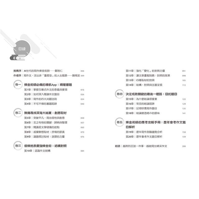 本書最為人津津樂道的是關於作文結構的煉金術,無論從審題到擬題,從開頭到結論,不外乎就是「內容、結構與修辭」的展演,並搭配相關範文的解說,尤其禹安老師格外強調「變化」,而萬變不離其宗,便是牢牢抓緊「對照」的訣竅,就像打通了任督二脈,假以時日,必定可成為一名優秀的寫作煉金術師。