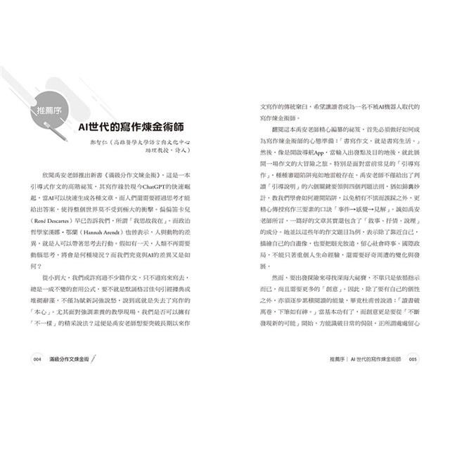 從小到大,我們或許寫過不少篇作文,只不過寫來寫去,總是一成不變的套用公式,要不就是默誦格言佳句、引經據典或堆砌辭藻,不僅為賦新詞強說愁,說到底就是失去了寫作的「本心」。尤其面對強調素養的教學現場,我們是否可以擁有「不一樣」的精采說法?這便是禹安老師想要突破長期以來作文寫作的傳統窠臼,希望讓讀者成為一名不被AI機器人取代的寫作煉金術師。
