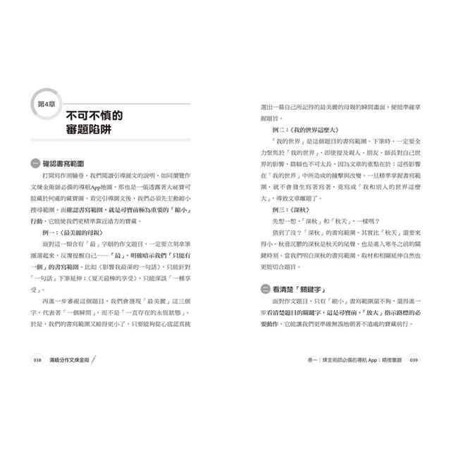 翻閱這本禹安老師精心編纂的祕笈,首先必須做好如何成為寫作煉金術師的心態準備:「書寫作文,就是書寫生活。」然後,像是開啟導航App,當輸入出發點及目的地後,就此展開一場作文的大冒險之旅。特別是面對當前常見的「引導寫作」,種種審題陷阱宛如地雷般存在,禹安老師不僅給出了判讀「引導說明」的六個關鍵要領與四個判題法則,猶如錦囊妙計,教我們學會如何避開陷阱,以免稍有不慎而誤踩之外,更精心傳授寫作三要素的口訣「事件→感覺→見解」。誠如禹安老師所言,一篇好的文章其實還包含了「敘事、抒情、說理」的成分。她並以這些年的作文題目為例,表示除了靠近自己,描繪自己的自畫像,也要把眼光放遠,留心社會時事、國際政局,不能只著重個人生命經驗,還需要好奇周遭的變化與發展。
