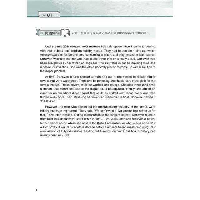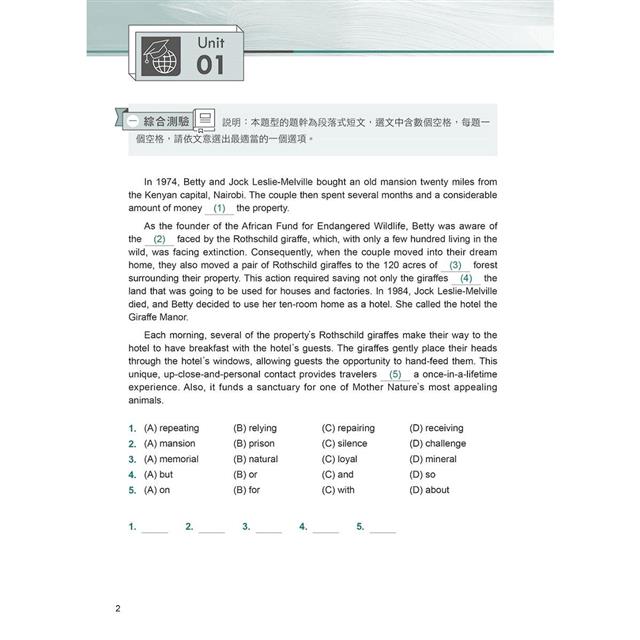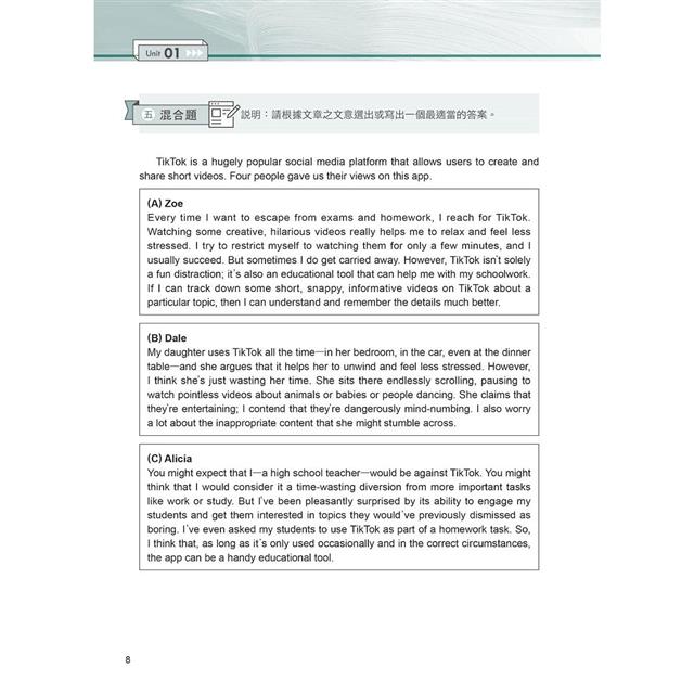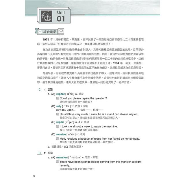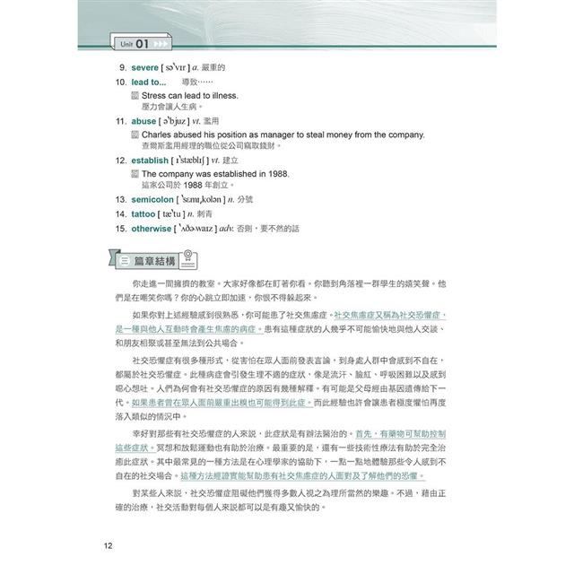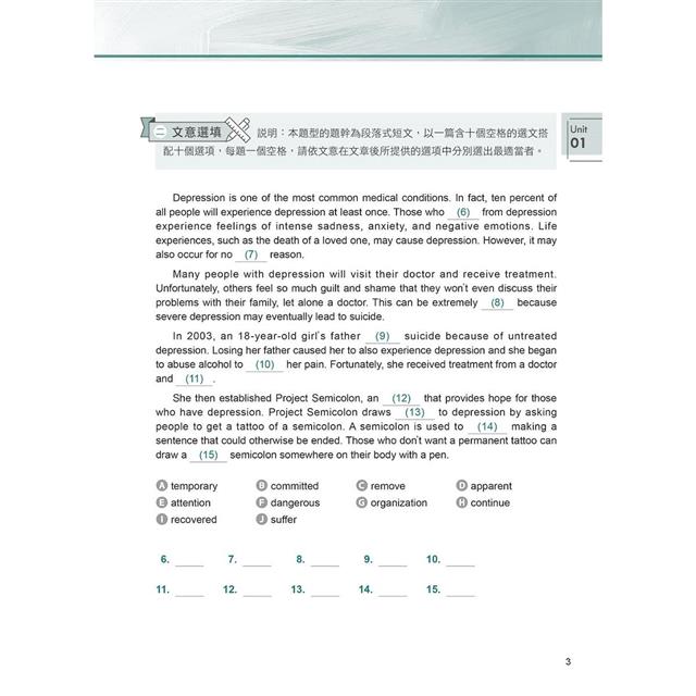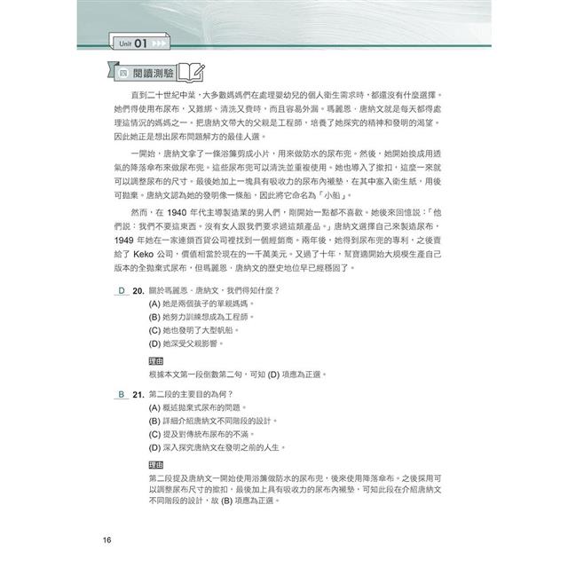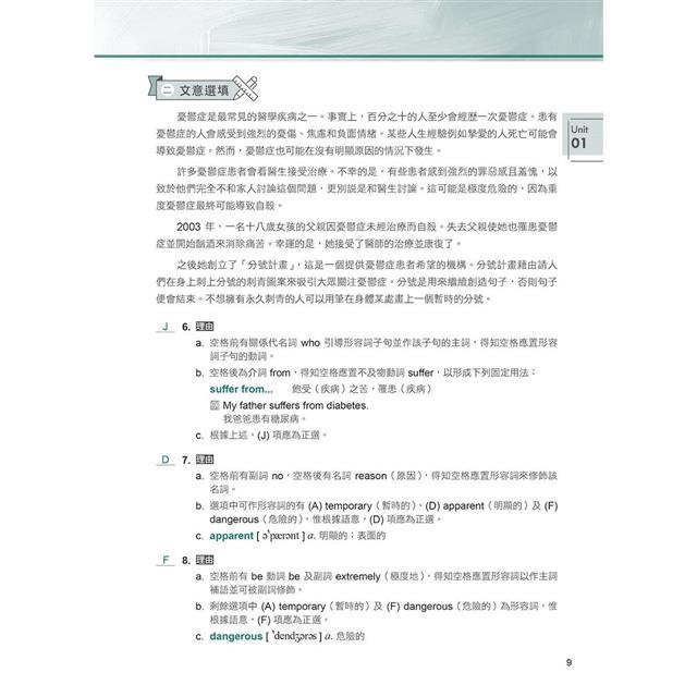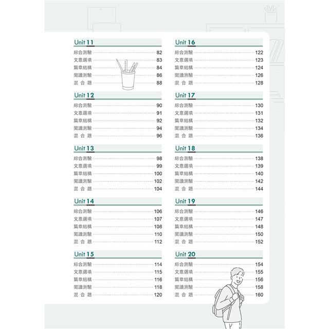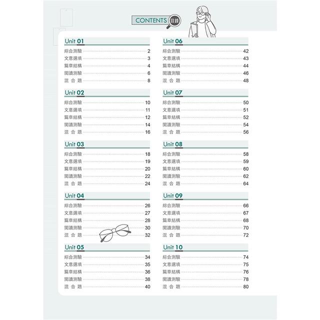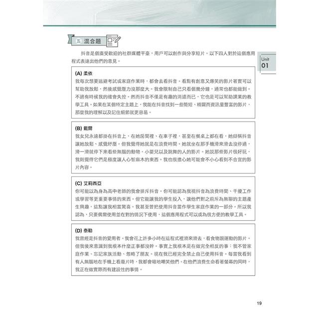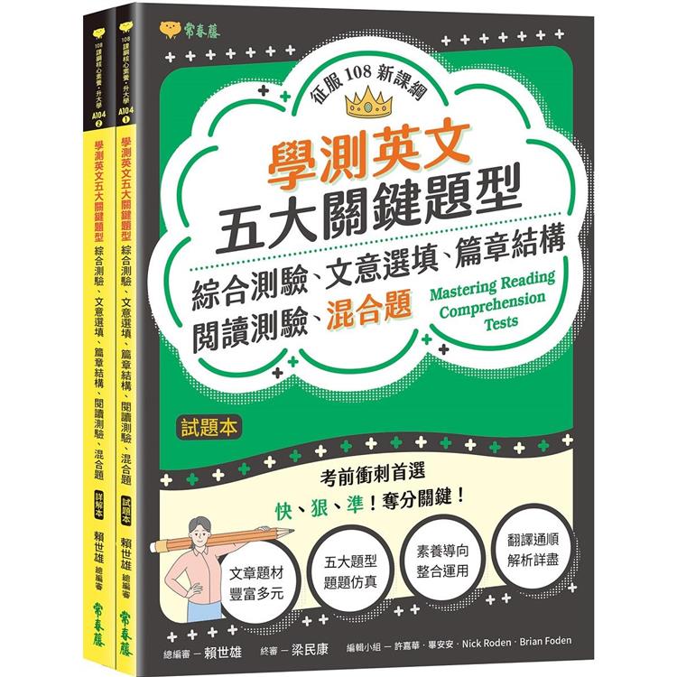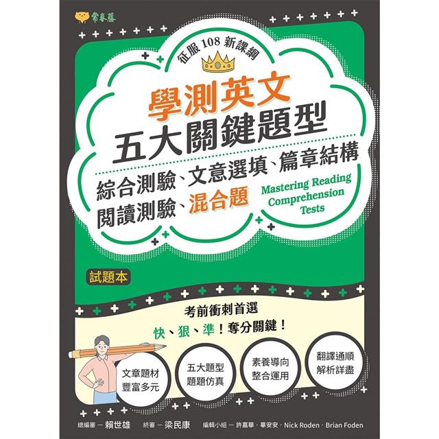 為此,本人召集常春藤中外編輯團隊,研討108課綱大學學測考題命題重點方向,特編撰《學測英文五大關鍵題型:綜合測驗、文意選填、篇章結構、閱讀測驗、混合題》一書。全書共20回,每回均涵蓋五大題型,文章選材豐富多元,以素養導向跨越各個領域;題型設計參考教育部所公布的準則與大學學測考題,題題仿真,翻譯通順,解析詳盡,期盼對莘莘學子有所助益。各位若能熟讀本書並反覆練習,未來參加英文學科能力測驗,必能勇奪高分!