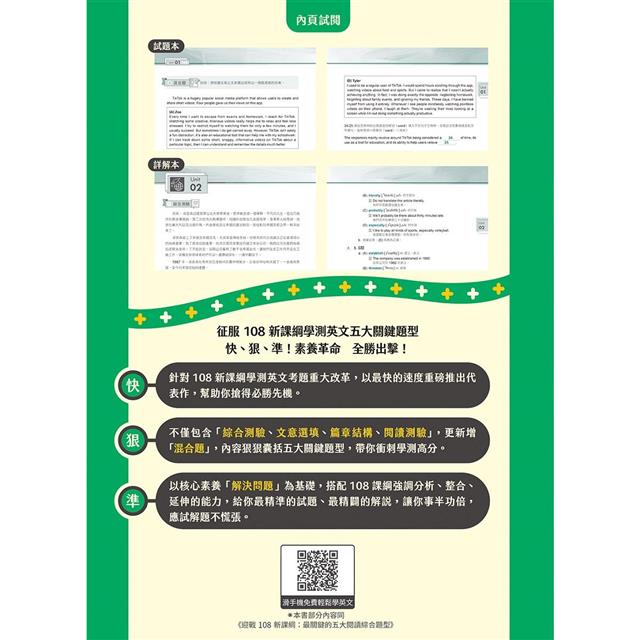 【狠】不僅包含「綜合測驗、文意選填、篇章結構、閱讀測驗」,更新增「混合題」,內容狠狠囊括五大關鍵題型,帶你衝刺學測高分。